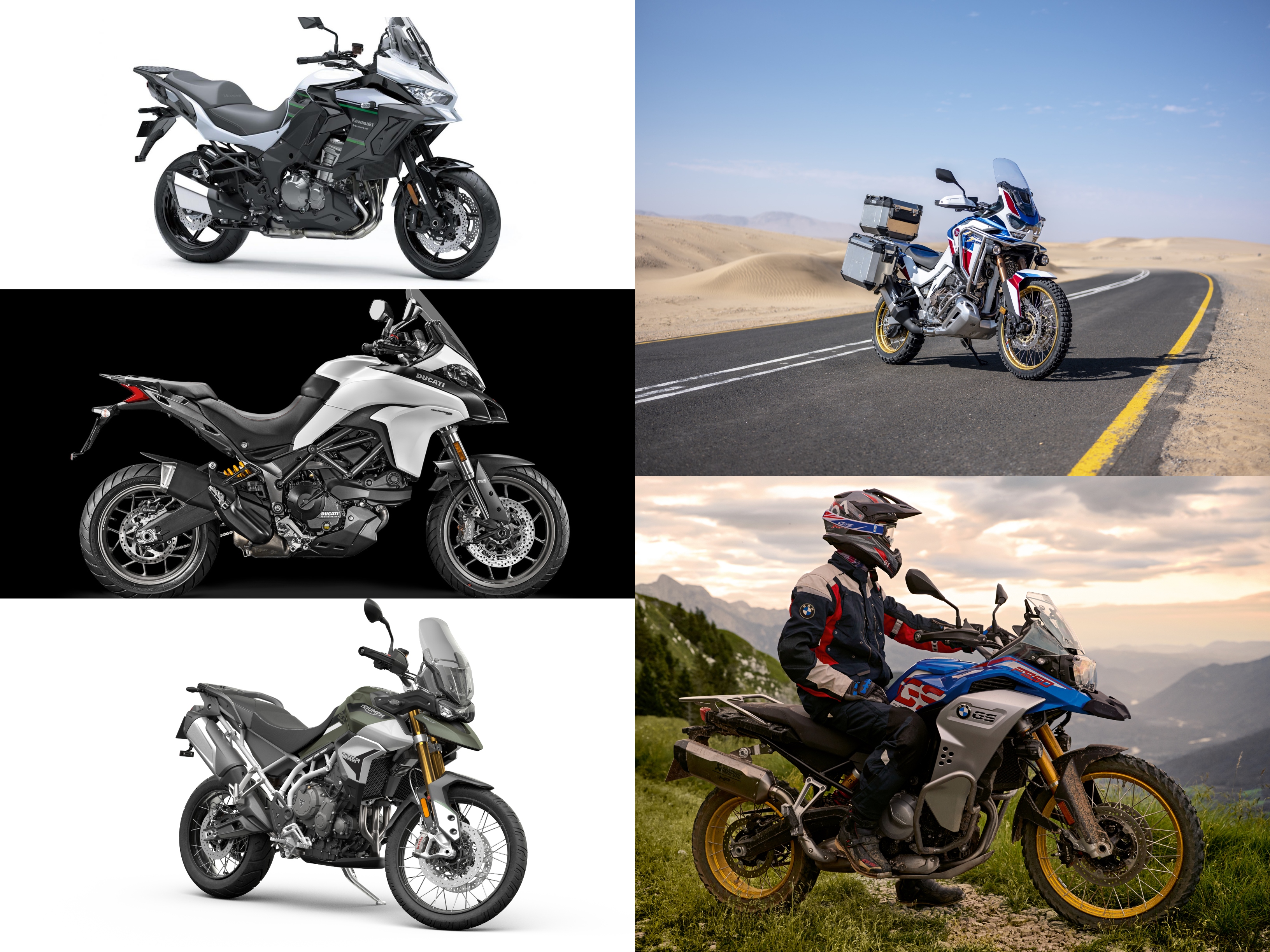 We bring the long-distance adventure touring bikes head-on against each other, the Honda Sports Africa Twin ES DCT v Kawasaki Versys 1000 SE LT+ v BMW F 850 GS v Ducati Multistrada 950 v Triumph Tiger 900 Rally Pro