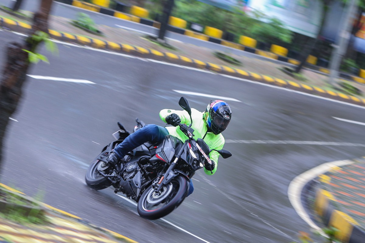 The Pulsar N160 is agile and easy to maneuverThe chassis of the top-end Pulsar N160 is identical to the Pulsar N250. The 160 also benefits weight reduction of almost 8kg in this dual-channel ABS variant, courtesy of the smaller engine. That, with the same chassis setup as the 250, makes this an agile bike, that’s easy to maneuver. This is also helped by the easily accessible 795mm seat height. The ride quality of the N160 is well sorted. The new Pulsar is set up to be comfortable and competent for city riding and the occasional spirited weekend rides. The bike handles bad roads, speed breakers and potholes with ample poise and composure, leaving you in control the whole time. In terms of handling, the bike feels extremely neutral and I mean this in the best way possible. The riding position is such that you maintain an upright, commuter friendly stance, with feet ever so slightly rearset. This rider's triangle gives you a commanding stance. The N160 offers predictable handling and cornering manners, throwing no random surprises your way. The chassis setup is relaxing. When you want to have some fun, the N160 lives up to its Pulsar nametag, making carving corners a fun affair. As we rode the bike exclusively in the rain, we can't tell you just yet all about the N160’s full handling potential, but what surprised me was the confidence the MRF Zapper-S tyres instilled. Despite an incessant downpour, the N160 gripped the tarmac well. Good tyres help the brakes and the Grimeca callipers perform well. With progressive, potent bite and all the feedback you need, the N160 brakes do a good job of shedding speed safely. Even the dual-channel ABS is well calibrated, so not once did I get any unsettling ABS feedback at the levers. One thing that would have made me enjoy the N160 ride more, would be a slightly wider handlebar, to give you better leverage over the bike.