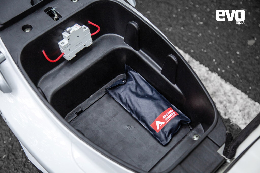 The brakes, too, are a trick, cutting off power when you touch the lever, with the combined (or ‘Harmonised’ as Ampere calls it) braking, keeping everything copacetic, despite the all-drum setup. The regeneration feature reroutes kinetic energy lost while coasting or braking back into the battery, which meant I still had two bars left on the meter after the 60km ride. Also, the lower of the two riding modes limits the top speed to 39kmph, making the claimed 75km range perfectly doable. Another convenient feature is the secondary charging point on the body that you can connect via cable to an outlet, and the switch under the seat can be turned off to avoid losing charge when parking the Zeal for extended periods.
