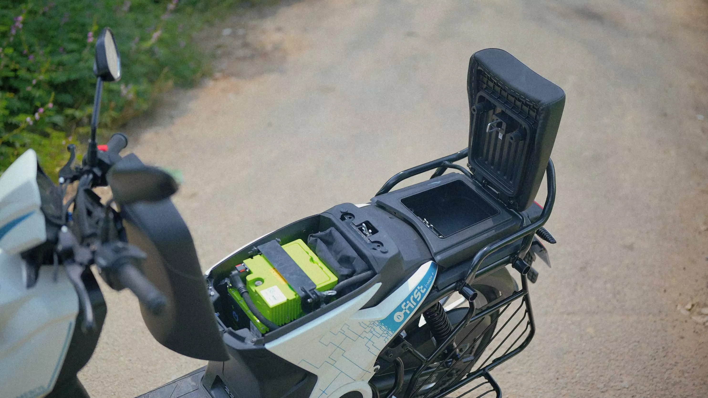 The Numeros N-First looks very different from the host electric scooters that you see on the roads today. Two major reasons for that are the slender design and the fact that it gets 16-inch wheels at the front and rear. At the front, you have a body-matched visor that sits on the handlebar and around the instrument cluster. Below that is a small fairing that houses the circular LED headlamp. Further below, you have a body-colour-matched mudguard that sits atop the 16-inch wheel. Under the LCD cluster, there’s also a factory-fit phone holder, which is a welcome addition. From the side, you have a low-slung floorboard, a great thing owing to the fact that many EVs have a ridiculously high floorboard. The scooter deploys a split seat design and both seats open – the front reveals the battery and charger, and the rear has a small storage place, enough to keep a wallet and a few small knick-knacks. There’s also a small storage cubby under the mat on the floorboard. This is where you will find the toolkit and the first aid pack. The storage space is not ideal but that is the cost of larger wheels. And if I were to choose between the two, I’d choose the better ride quality courtesy of larger wheels over storage any day. Overall, the design of the Numeros N-First is likeable, but the fit and finish levels need to improve.