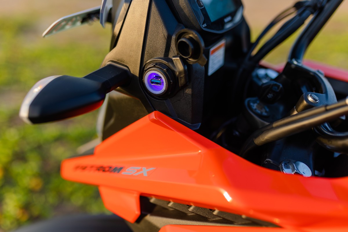 USB charger, a fully-digital instrument cluster, and dual-channel ABS available on the V-Strom SXIn terms of features, you get all-LED lighting at both ends, a windscreen, knuckle guards, a tail rack rated for up to 6kg of luggage and a USB charger. As far as the USB charger is concerned, its design feels like an afterthought. It is placed on the left side of the instrument cluster and the flap opens towards the rider which feels inconvenient. The instrument cluster is a fully digital LCD unit which showcases all the necessary information and can also be paired to your smartphone for turn-by-turn navigation. Now unless you pair your phone, the cluster seems very barren, something that could have been better designed. In terms of safety, you get a well-calibrated dual-channel ABS.