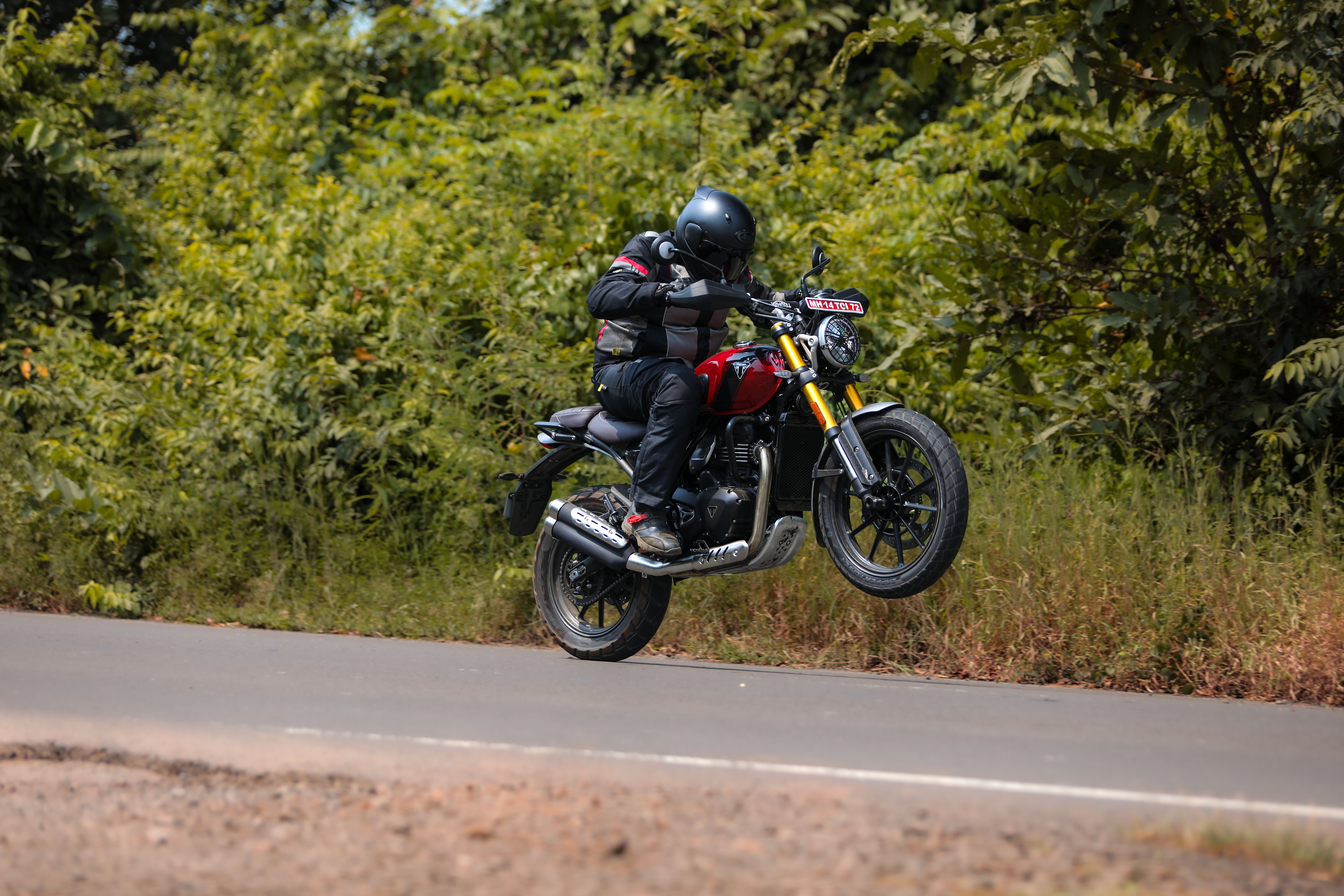The ride quality of the Scrambler 400 X is exceptional. It is well judged and goes over most undulations without really breaking a sweat. It does this without feeling too soft or squishy, which means that it does still inspire a lot of confidence even when you tackle a set of corners. For obvious reasons, this is not going to be nearly as sharp a handler as the Speed or other naked bikes but it is far from lazy either. The 19-inch front does require a bit of effort to turn in but the Scrambler is still fairly sharp and is a lot of fun in the corners. The bike turns in well, stays stable through the corner while holding the line without any drama. The entire chassis and engine package of this bike like the Speed 400 is one that is easy, forgiving and non-demanding, making it easy even for relatively newer riders to get on and not get too intimidated. The new 19-inch front and 17-inch rear wheel setup are shod in MRF Nylogrip Zapper Kurve tyres which, in my time riding the Scrambler proved to be quite capable. They held grip well in the corners and under braking and even off-road, in gravel and similar terrain they will be more than enough.