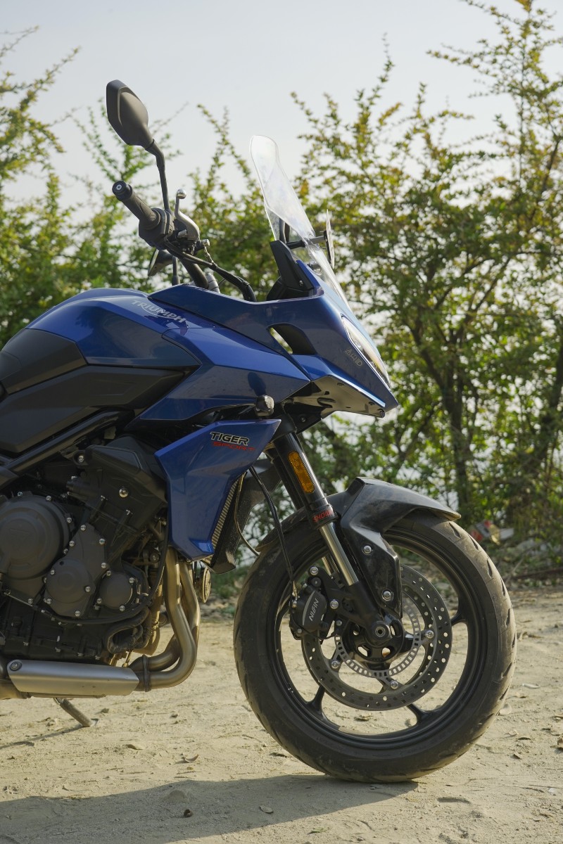 Showa Separate Function forks boast 150mm of travelThis meant that the Tiger Sport 660 didn’t bottom out even on taller bumps and breakers. Even the rear monoshock now gets a remote preload adjuster to make for easier adjustment especially when you quickly want to change the preload on the go or when you’re with a pillion or with luggage. In terms of ride quality, the ride is significantly better than on the Trident 660 and the damping feels softer as well, an issue that plagued the Trident. The Tiger Sport 660 soaks up smaller bumps rather well and is only unsettled by the bigger undulations. At 206kg (wet) the bike is up 17kgs over the roadster but does a decent job of handling its mass. Now since this is a sport-tourer, the ergonomics have been made to be more relaxed. Meaning it now has a taller wider handlebar and more relaxed placement for the footpegs. So, to ensure that the bike still feels sporty, handling wise, especially with the added mass, the rake has been sharpened ever so slightly. The good news is that the bike retains most of the sporty handling chops of the Trident while also becoming a comfortable mile muncher. The bike also gets the same sticky Michelin Road 5 tyres that we all loved the Trident 660 for. So when you do come across a set of twisted be rest assured that you will have a lot of fun. The added suspension travel also means the bike can handle some light soft-roading, meaning the going doesn’t need to stop when the tarmac isn’t perfect. This setup is not without its flaws though. The Tiger Sport 660 uses the same braking setup found on the Trident 660. The brakes don't have as much feedback as I would have liked and there's a weird issue where the brakes feel extremely wooden, momentarily, if you hit a bump while taking a corner, that is something that definitely needs to be addressed.