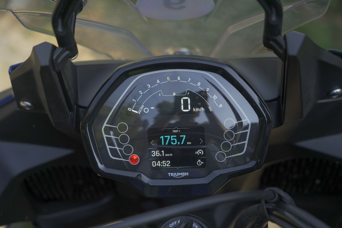 Instrument cluster is the same as that on the Trident 660Behind the windscreen, you have the instrument cluster which is the same physical units as those found on the Trident but in a different housing. The next big change is the bigger fuel tank which now holds up to 17.2 litres of fuel which is roughly 3.2 litres more than the trident and this is to aid in long-distance touring. Triumph claims that you can get a respectable 380km from a full tank of fuel. Moving behind, you have a nice roomy seat both for the rider and the pillion which is pretty comfortable for long days in the saddle. I rode the bike for around 250km with a mix of twisties and highways and I had no discomfort post the ride.