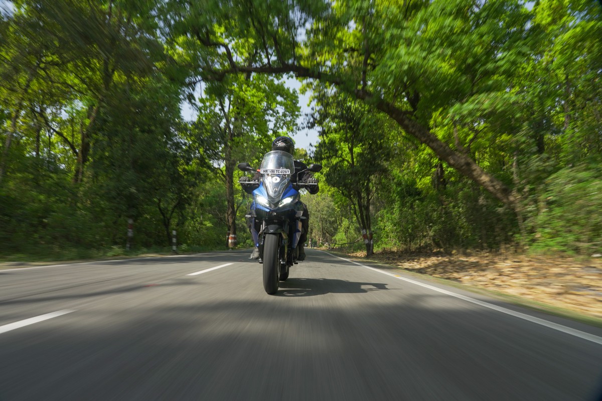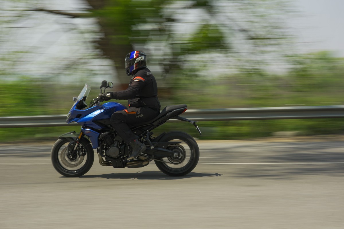 Now on the performance front, the Tiger Sport 660 is powered by the same 660cc inline triple as found on the Trident and it is in the identical state of tune as well. So, you have 80bhp at 10,250rpm and 64Nm of peak torque at 6250rpm at your disposal. The engine is extremely tractable and has enough grunt in the low end and the mid-range to not need to constantly work the slick six-speed gearbox. The top end of the bike is not as potent as it is on something like a Street Triple but that is honestly fine considering you’d be cruising around the mid-range for most of the time anyway. Speaking of cruising, with the addition of the windscreen and the fairing, if the roads allow it, you can comfortably cruise at 120kmph all day long without the engine feeling stressed or you getting fatigued because of windblast. Now, because of the added mass, the Tiger Sport 660 does feel a little slower than the Trident 660, but not by a huge margin. My only major complaint in this department is the rudimentary traction control system. The traction control kicks in at the smallest sign of trouble and it stays on for longer than it should. This is something that could definitely do with an overhaul. But you do have the option to turn it off, so if you trust your throttle hand enough, you can do that.