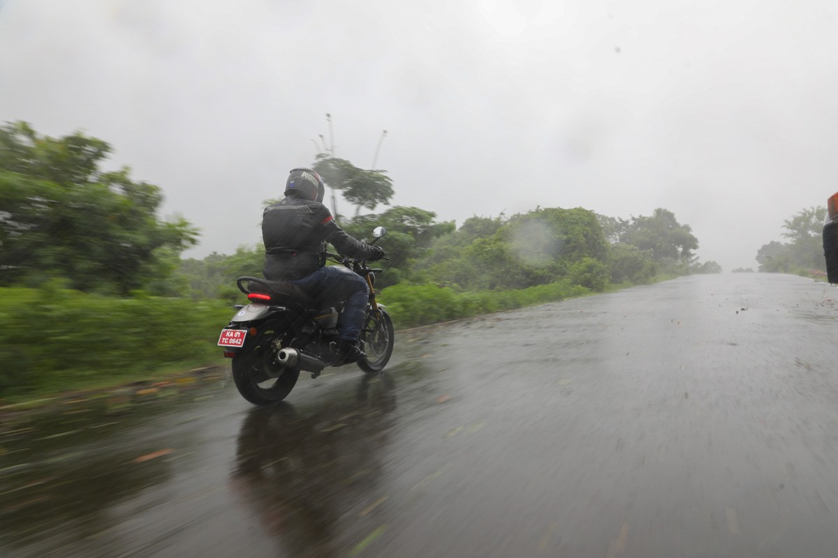 The TVS Ronin gets a new chassis. There’s a double-cradle frame, that hangs off Showa- 41mm USD forks up front and a gas-charged rear monoshock. The new TVS gets 17-inch wheels and newly-developed TVS Remora dual-purpose tyres, called Rumbler. Now this along with the relaxed ergonomic setup makes for a relaxed ride. This is not an apex hunter as you know its Apache sibling is, and neither is it a dedicated off-roader or outright cruiser. The Ronin is set up such that it can do a fair bit of everything, in some capacity. This can’t be my final verdict however, considering I rode the Ronin in Goa’s torrential downpour, exclusively. So I've got to reserve the final verdict for when we test the Ronin in better conditions. The tyres offered reasonable grip in the wet, however, when you really push that the front, they start to give and confidence is hampered. Ride quality is plush with the forks and monoshock set slightly on the soft side. The Ronin soaks up small bumps and potholes quite well and I found myself voluntarily jumping some larger speed breakers as well. So you can have some fun on this TVS. Braking duties are handled by a 300mm disc up front and a 240mm rear disc. You get dual-channel ABS on the top-end variant that we tested. The ABS has been calibrated with two modes ‘Rain’ and ‘Urban’ that work rather well. Even under hard braking in the wet I never felt the ABS on my brake levers and I could come to a controlled stop rather well. The brakes seemed to work well in the rains with linear bite and progression, although how they hold up in the streets, remains to be seen.