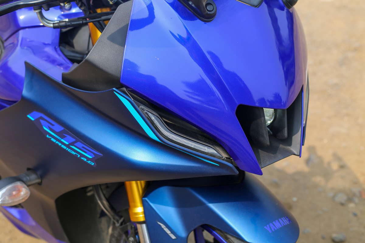 The R15 V4 is a gorgeous looking machine. It gets a redesigned front end and the bike now resembles the bigger R7 and for that, it gets a big thumbs up. The fairing design is more than just a cosmetic update. The bike is now more aerodynamic with a lower drag coefficient and it offers better wind protection too. In the flesh, the motorcycle looks imposing too! Especially if you keep it next to the R15 V3. In the new fairing also sits a new bi-function LED projector headlamp with new DRLs on either side, reminiscent of the ones found on the R7 and R6. This new setup does a great job of illuminating the road ahead of you and I barely found the need to use high-beam.
