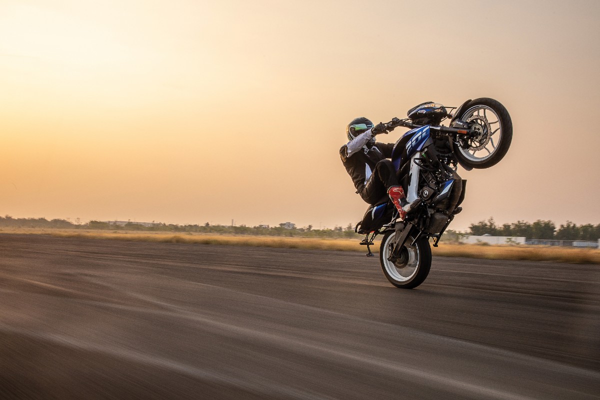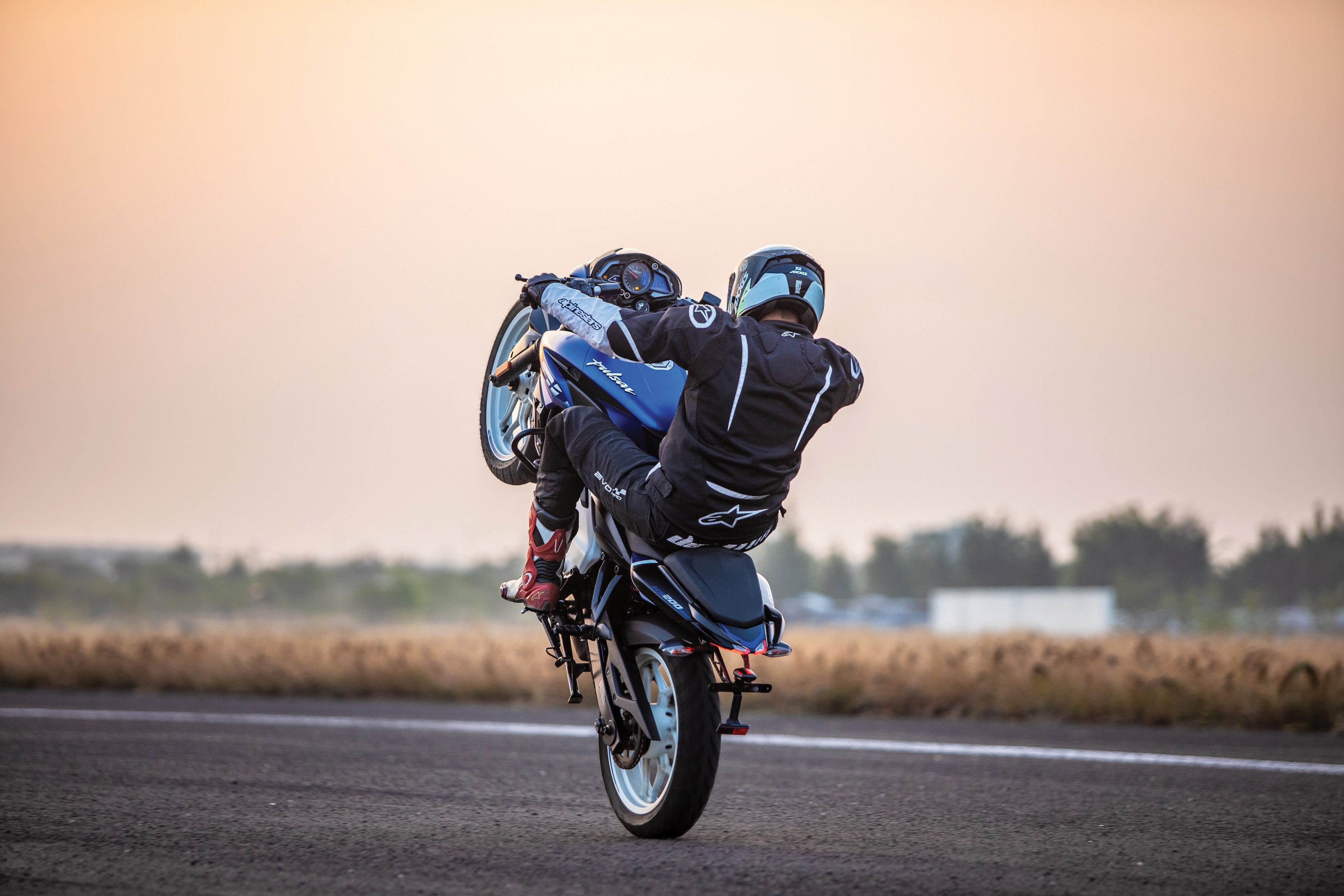 Whether it be the 160 or 200, they both stand apart from all the rivals with a host of segment-first features. The stiff perimeter frame endows them with balanced, predictable handling. And they both boast the highest power output in their segments (16.7bhp for the 160, 24.2bhp for the 200) with Bajaj employing its unique triple-spark technology. This, combined with the precise throttle control makes the Pulsar NS series bikes the ideal wheelie machine for both rookie stunters as well as stunt gurus, like Hrishi Mandke.