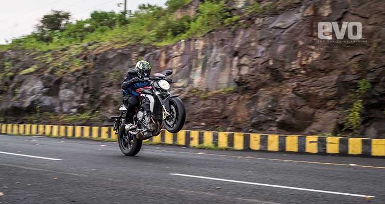 Inspite of all these electronic aids, the Brutale remain motorcycle with velociraptor-sharp reflexes. The riding position is upright and surprisingly comfortable. The seat though tapers towards the tank so that all your weight is canted towards the front end and this takes some getting used to. The narrow tank could also make do with thigh grips. Fire her up and the Brutale settles into a moderately loud and staccato idle. At low revs the Brutale is deceptively docile and linear. There is a hint of grumble at low revs which smoothes out as the revs rise.Once past 4000rpm, no matter how progressively you wind the throttle, the front wheel just aims for the sky. In fact, it accelerates with such ferocity that your mind goes into survival mode, instinctively signalling the right wrist to back off, yet hold on and past 11,500rpm you are rewarded with another almighty shove that injects adrenaline straight into your cranium. At high revs, the glorious in-line three cylinder scream fills up your helmet. I wish I could bottle up this symphony and hear it at will. Snick up the clutchless quickshifter, feel the Brutale do a little headshake as the front goes light and before you realise it, you are on the north side of 200.