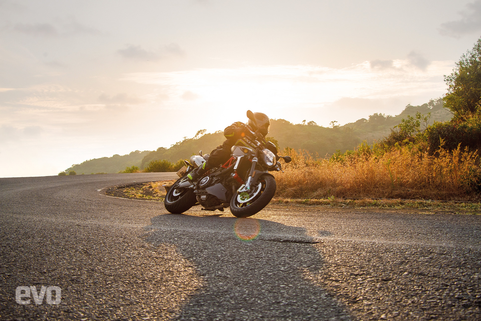 The 896cc, V-twin motor is a stroked out version of the Shiver 750’s motor with subtle changes. The Shiver 750 is obviously the 900’s predecessor, which never made it to our shores. When it comes to the 900, we are not sure if the product brief the engineers received was about a cruiser or a naked though. We suspect, it’s the latter. Weighing 218kg, the Shiver is heavier by the segment benchmark – the Street Triple RS by over 30kg. Not just that, crank the engine and the purposefully built pipes give out a thumping sound, reminding you of British twins! And the exhaust pipes have a design feature too; they do not leave carbon footprints on the rider’s clothing unlike on the Shiver 750, thanks to their ‘sealed shut’ design. The riding position is comfortable for long journeys but not really aggressive like you’d want on a typical mountain sheep kind of bike. The well-cushioned seat gets you a lot of space to move around as well.