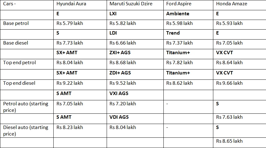 Hyundai Aura vs rivals: Pitting it against the Maruti Suzuki Dzire, Ford Aspire and the Honda Amaze