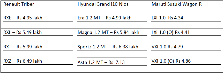 The variant-wise prices of the Reanult Triber, Hyundai Grand i10 Nios and Maruti Suzuki Wagon R are as follows: