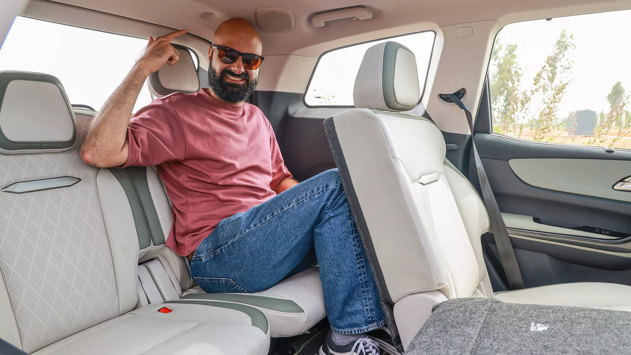 The second row is where the real party is. You get generous amounts of space — both kneeroom and headroom — and loads of kit. Mahindra has now added seat ventilation to the second row, you also get sun blinds, a tray table, a wireless phone charger and a dock for an entertainment screen. The bench slides and reclines as well, and this does add to comfort but also allows for some amount of flexibility when you have people in the third row. Interestingly, despite the batteries being in the floor, you don’t feel a major lack of under thigh support either