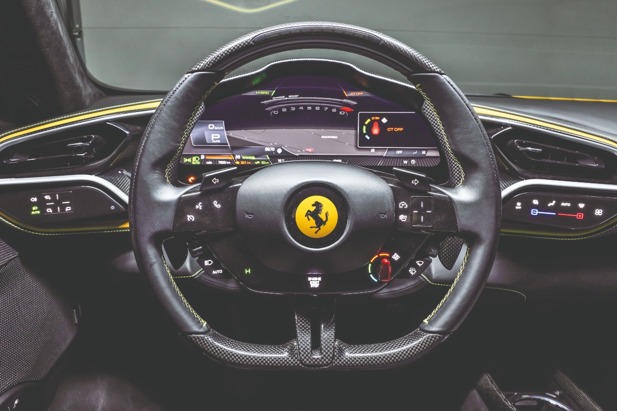 The steering wheel has all the typical Ferrari quirks, including the Manettino knobOn the inside, there’s been wholescale adoption of tech from the SF90. You press the capacitive ‘Start Engine’ button on the steering, much like the Roma, and all the displays gradually spring to life revealing an intensely technical cabin with a completely digital interface. You have a digital cockpit that shows you everything including maps, infotainment, the CarPlay projection, drive modes you are in, everything. You control it all via two islands of capacitive touch clusters on either spoke of the steering and half the time you don’t know if your prod or twirl or punch has even registered. The steering wheel is a veritable forest of controls and now in addition to the traditional Manettino there’s an e-Manettino that gives you four modes for the hybrid powertrain: eDrive, Hybrid, Performance and Qualify. Default is Hybrid and invariably that’ll have you moving off in pure electric. It’s a strange sensation, to be driving a Ferrari without any noise, but it’s the mature, grown-up, eco-friendly way of doing things in 2022. Punch the red Manettino knob and the bumpy road setting is activated on the magnetorheological dampers which really deliver astonishingly good ride comfort. The 8-speed twin-clutch automatic is mind-boggling in its immediacy yet as chilled out as a regular automatic when you’re pottering around. This is a Ferrari that you can use everyday: comfortable, luxurious, easy-going, quiet, and there is nose-lift for when you encounter nasty speed breakers on the way to the race track.