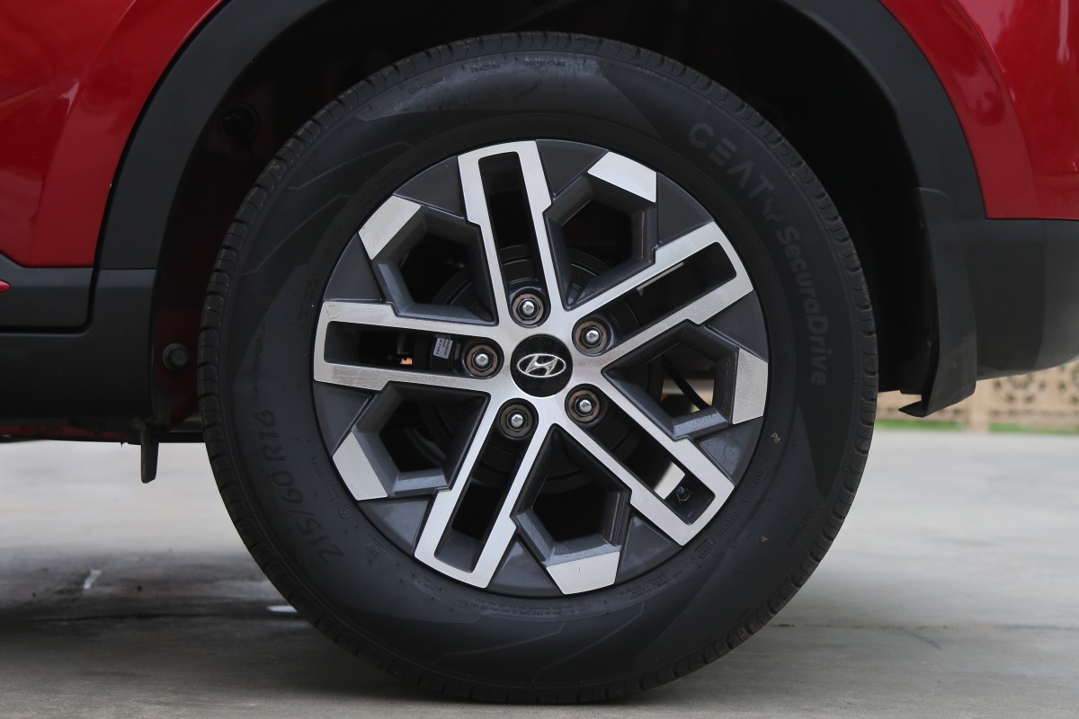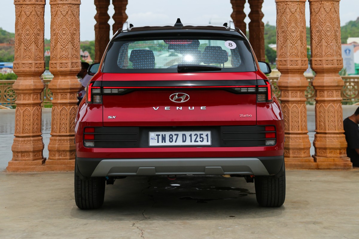 Move over the side and the Venue continues to get 16-inch alloy wheels but they now wear a different design. The fiery red paint that you see on our test car is also new and it is complemented by the black roof, not to mention the bevy of black cladding which flanks the sides and the wheel arches. Over at the rear, is another big change, the connecting LED tail lamps, which are identical to the Volkswagen Taigun’s, as our followers on Instagram repeatedly remind us, and the rear bumpers too are now reprofiled.