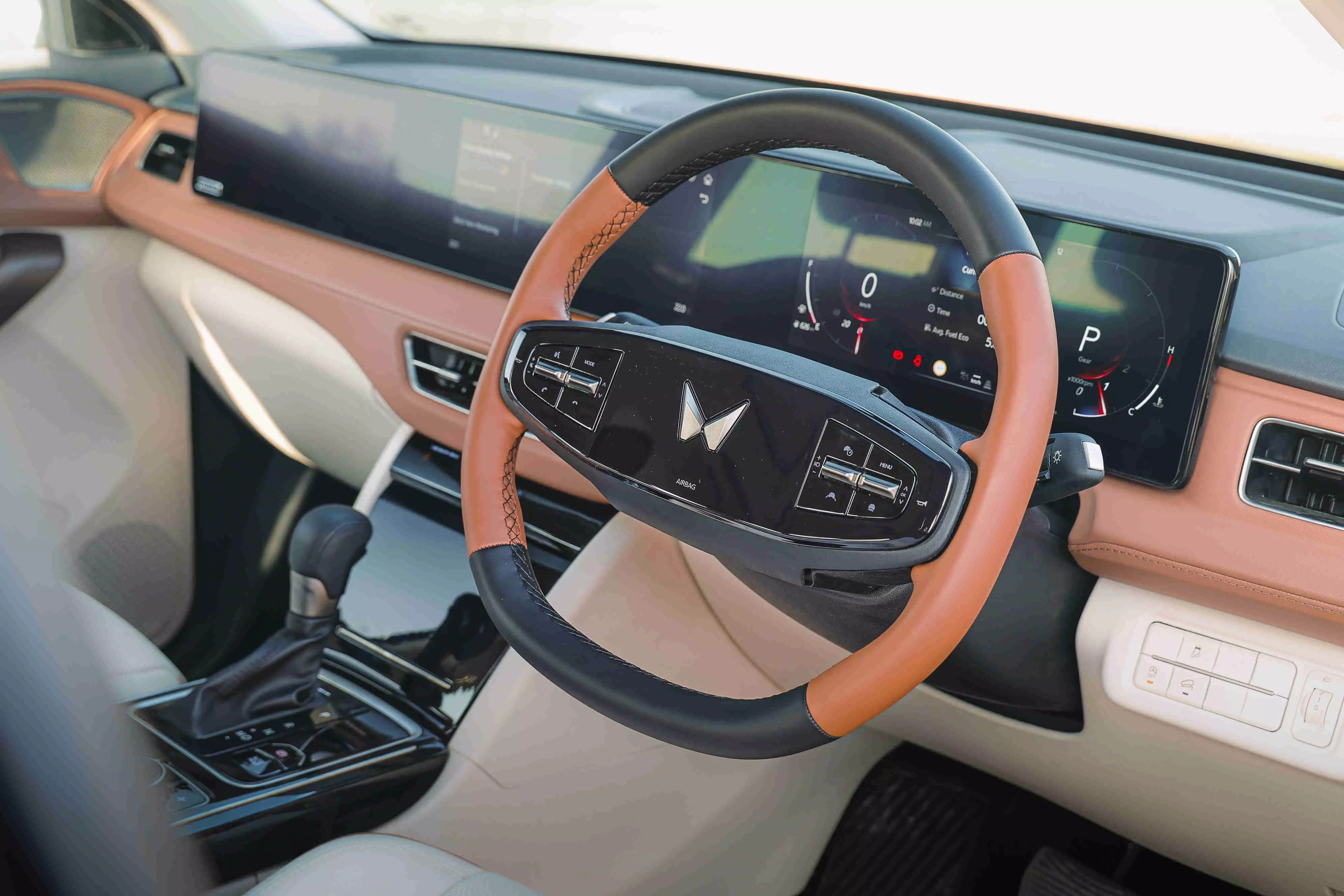 The Mahindra XUV 7XO’s biggest changes lie inside the cabin. The interior has been completely revamped, and I have mixed opinions on this, which we’ll get to in a bit. First, let’s talk about what’s new. As soon as you step in, the first thing you’ll notice is the steering wheel. Instead of the three-spoke wheel from earlier, there’s now a new two-spoke steering wheel – the same one you see in the Mahindra XEV 9S. Here, it gets a proper physical Twin Peaks logo instead of the backlit logo in the XEV 9S. There’s also a two-tone leatherette wrap that matches the seats and dashboard, and the wheel can be adjusted not just for rake but also for reach. That said, some may find that the seat base sits a little too high and doesn’t go as low as they’d like. I’m short, so that wasn’t a problem for me, but what did bother me was the steering column height. Even at its lowest setting, the steering wheel still feels mounted too high – an issue I had with the XUV700 as well. It doesn’t take away from how well the car drives, but it is something you notice every time you get behind the wheel.A major feature that it missed out on is paddle shifters!