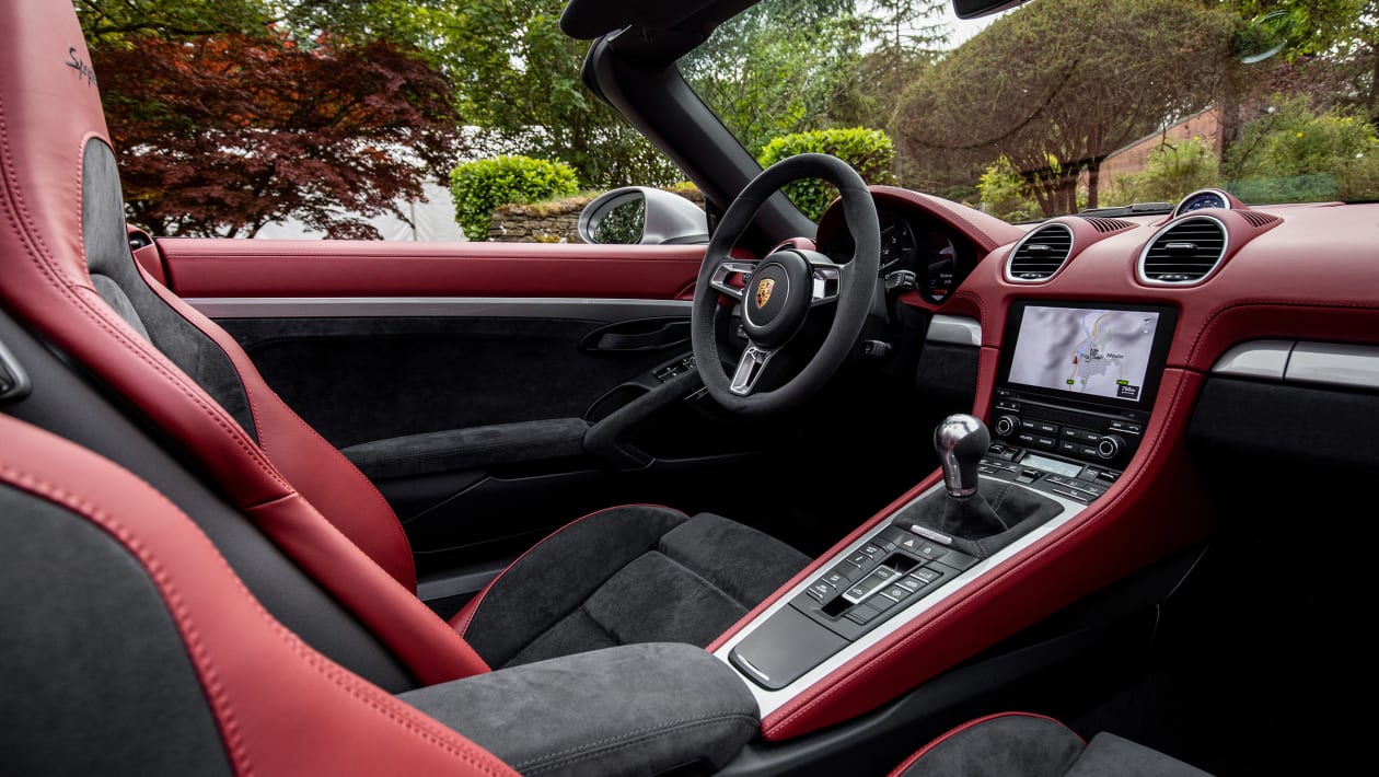 The only real difference between the Spyder and GT4 this time is the aerodynamic package. On aesthetic grounds Porsche decided not to fit the Spyder with a big rear wing (correct decision) and has instead gone for a smaller wing that retracts back into the rear bodywork at low speeds, plus the front splitter is nowhere near as pronounced. So, the Spyder generates no lift as such, but also no downforce. Unlike the GT4.