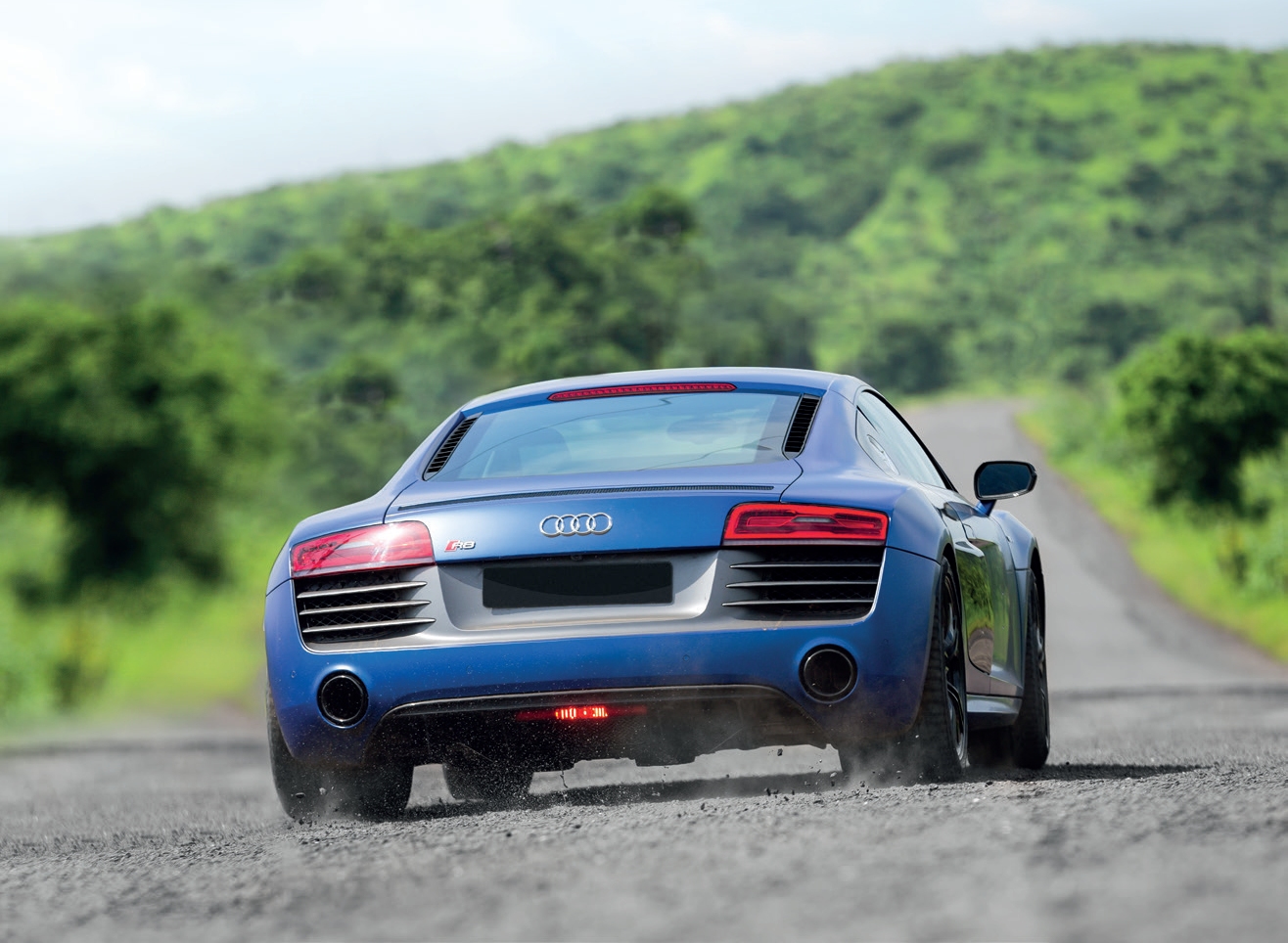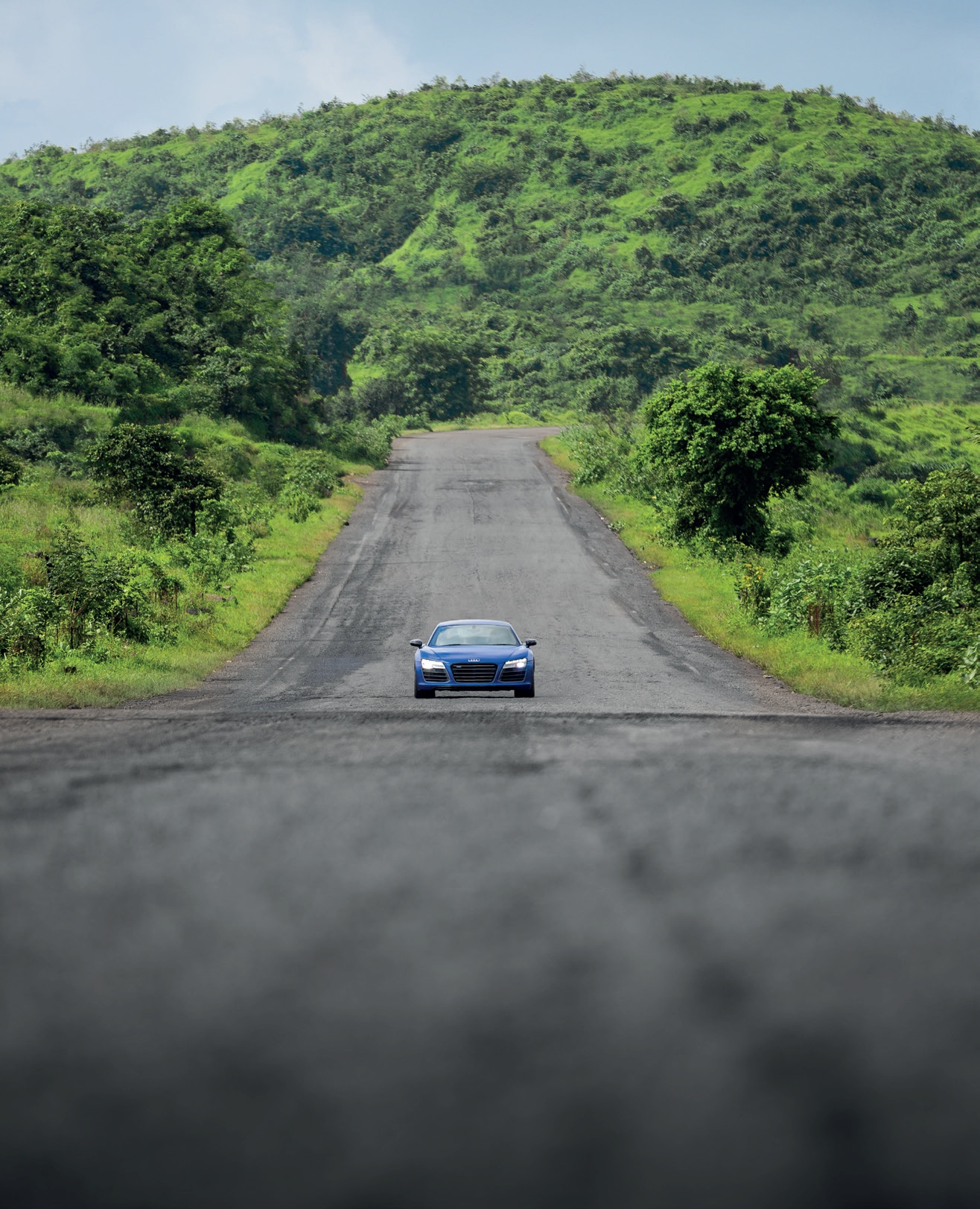 200kmph and the R8 is accelerating hard. 8400rpm, flick the right paddle and select fourth on the S Tronic gearbox, a dual-clutch unit that delivers clean, hard shifts, a world away from the old R-Tronic gearbox. The road, like everything in our country, isn’t smooth but the small revisions to the suspension make it more planted, the small compressions and dips are taken in her stride and she never wavers from the straight ahead. All four wheels stay glued to the road, even on the one nasty bump that is taken at a much higher speeds on this run. The vice-like grip remains on the steering wheel but is probably not required. I’d have chickened out by now in another super car. The R8 delivers confidence. It literally holds your hand.