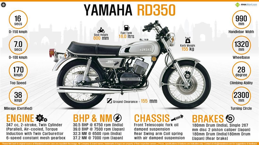 The specs on RD350 in India and JapanIndia is a country that gives more importance to utility and economy. In an attempt to achieve a better fuel economy, the RD was detuned for the Indian market. This attempt was rather unfruitful, as the fuel economy of the RD compared to its then competitors Yezdi Roadking, Jawa 350, and Royal Enfield Bullet was still very less.