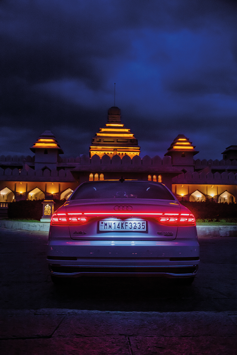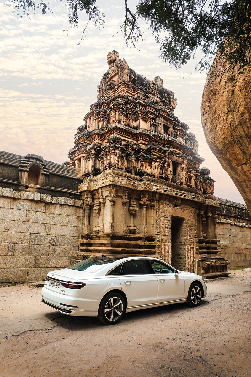 Audi A8 L looks stunning from the rear especially at duskImmersing yourself in history is always enriching, it stimulates the mind, makes you aware of where things come from and, eventually, where we are headed. The ruins of Hampi are also a spectacular contrast to the hills around them. Of how man tries to impose his will on nature, but nature always has the last word. Humbling. As we approach the last 5km to Evolve Back, Hampi, it’s worth talking about the most impressive trick the A8 L has hidden inside those wheel arches. The predictive active suspension. Cameras are constantly scanning the road ahead and reacting to it before you hit it. It controls pitch when you accelerate and brake, keeps the body flat and level over bumps, limits the amount of roll in corners, and can even lift itself up 50mm to avoid a speed breaker completely. It’s some seriously complicated engineering but it’s very welcome (and rather effective) on Indian roads. It all adds to the luxury quotient of the A8 L, making it one of the most comfortable cars you can buy today, period