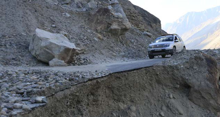 The road ahead is buried in rubble. It is nothing that the surprisingly capable Duster can’t handle though the road ahead disappears out of sight after the bend ahead. The smart thing to do is to walk down the road to scour for nasty surprises. Around the turn, we find a soldier and his excavator, who seems equally startled to see us. He turns out to be from Maharashtra (where we are based) and is overjoyed to speak in his mother tongue, giving us directions and assuring us that the road (if you can call it that!) to Agham is do-able, but even he didn’t have a clue about the state of the road to Durbuk. He helps us get on our way by flattening the rubble with a few thumps of the excavator’s giant claw and we are off. The roads ahead are fairly good and snake around the mountainside. That is until we turn a corner to see a portion of the road washed away. Vikrant insists he wants to take a picture and we get out of the vehicle only to discover to our horror that a little ahead, the earth below the tarmac surface has been washed away and half of the road was floating in air. Had we not stopped, we would have had a not-so-nice excursion a hundred feet down into the valley.