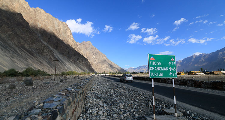 We are standing at a crossroad, contemplating. One sign leads to KhardungLa while the other points to an obscure village called Agham. A week ago, Ouseph pulled out a map of North India. “There is this road that connects Agham to Durbuk and leads to Pangong Tso. More often than not it is shut due to landslides, it is lonely like you wouldn’t believe and it is more spectacular that words can describe. Ben, would you like to do another Border Challenge?”