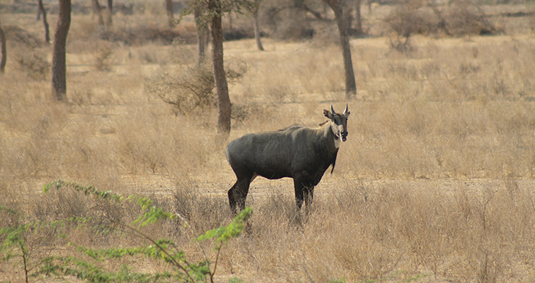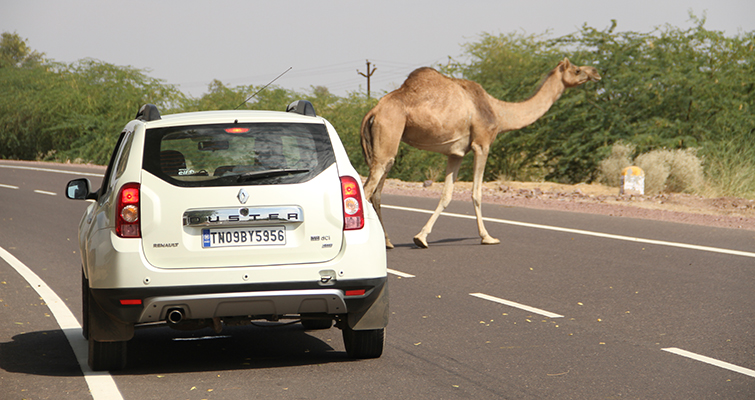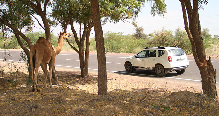 Before I say anything else, I must mention the AC in the Duster. The temperature outside was bloody hot, so much so that Gaurav decided to take a break from shooting. Thin as he is, the sun was burning his bones. But inside the car the AC worked its charm. So we carried along the straight road and suddenly I heard Gaurav shout, “Stop! Stop!”. Startled, I thought something was the matter, but then he pointed out to a herd of camels sitting by the roadside. He jumped out of the car and asked me to inch forward to get a closer shot. Subsequently, I got used to Gaurav’s signature “Stop! Stop!” cry. Every time we crossed a camel or a chinkara, Gaurav would shout out. After a while it became “Chodo yaar, we have enough.” After driving further down the road, I turned to see Gaurav glued to the window. “Nilgai dikh gaya!” Check! We had completed our list. The only one left was a leopard, but that was asking too much.