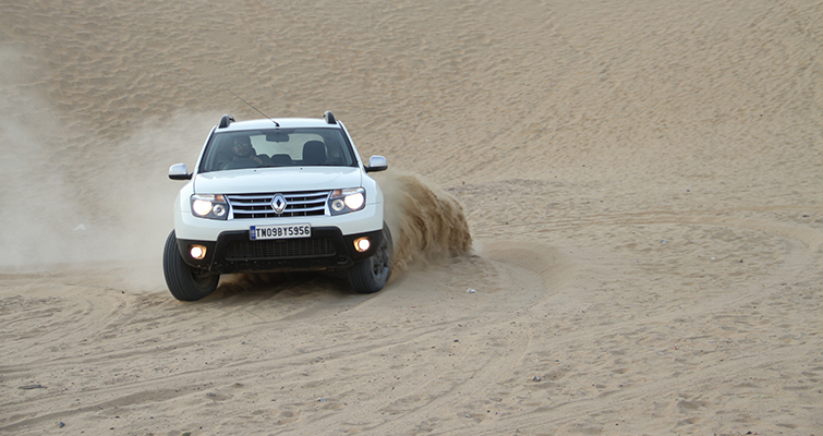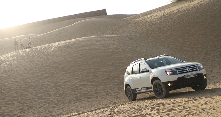 We left Barmer in the wee hours of the morning and headed to Munabao. Before the sun could rise, we had left the borders of Barmer city behind and found ourselves driving parallel to the train tracks – the only sign that we were, literally, on the right track to Munabao station. True enough the road was narrow and riddled with pot holes, but thanks to the brilliant suspension setup, the Duster sportingly took everything in its stride without letting go of its line. There was nothing in sight for miles together in that vast desert except for a few army trucks passing by and the narrow road cutting through it. After driving for about 180km, the road suddenly disappeared into dusty trail marks left by the army trucks. The last 20km to Munabao was a veritable wade through the sand. I changed over to 4WD and made a run for the border (I just wanted to say that). The fully loaded Duster AWD tackled the sand pretty easily without getting stuck. Slowly and steadily powering our way through, we made it up to the Border Security checkpost. I got out of the car and could still see the trail of dust I had left behind to get here. Finally, we made it to the border. Pakistan was just a stone’s throw away. As I turned towards the checkpost, I found myself staring down the barrel of a gun. I was taken aback. Before I could say anything the jawan pointed us in the direction we had come from and said “niklo”. I got back into the car and calmly asked him ‘kya hua sir’.