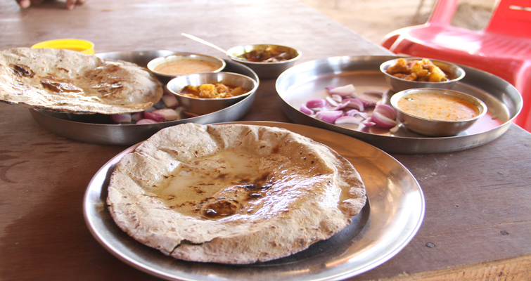 Gaurav begins referring to me as the ‘local boy’ and wants to know which wild animals we may spot along the way. I tell him about the chinkara, nilgai and of course, the camels. The nilgai belong to the deer family and get their name because of their close resemblance to cows and their bluish grey coat. Chinkaras and camels are easy to spot, but spotting nilgai can be slightly more challenging. From then on began the hunt to look for and shoot wild animals (with the camera of course). Gaurav spots a herd of baby chinkaras and we stop by the side of the road, take a few pictures and carry on. After driving for a couple of hours, the craving for laal maas – a specially prepared mutton dish in red gravy crept upon us. We stopped by a roadside dhaba at Doodhwa and before the menu could be given, we asked for laal maas and roti. To our dismay, this was a vegetarian place. The delicious garam rotis with aloo mutter ki sabzi abated our disappointment and while paying the bill I asked the owner where we could get laal-maas. What he said next took me by surprise. He said Jodhpur and the surrounding districts are dominated by the Marwaris and they are vegetarian, so it is difficult to find non-vegetarian food. And true to that, throughout the trip, we couldn’t satiate our craving.