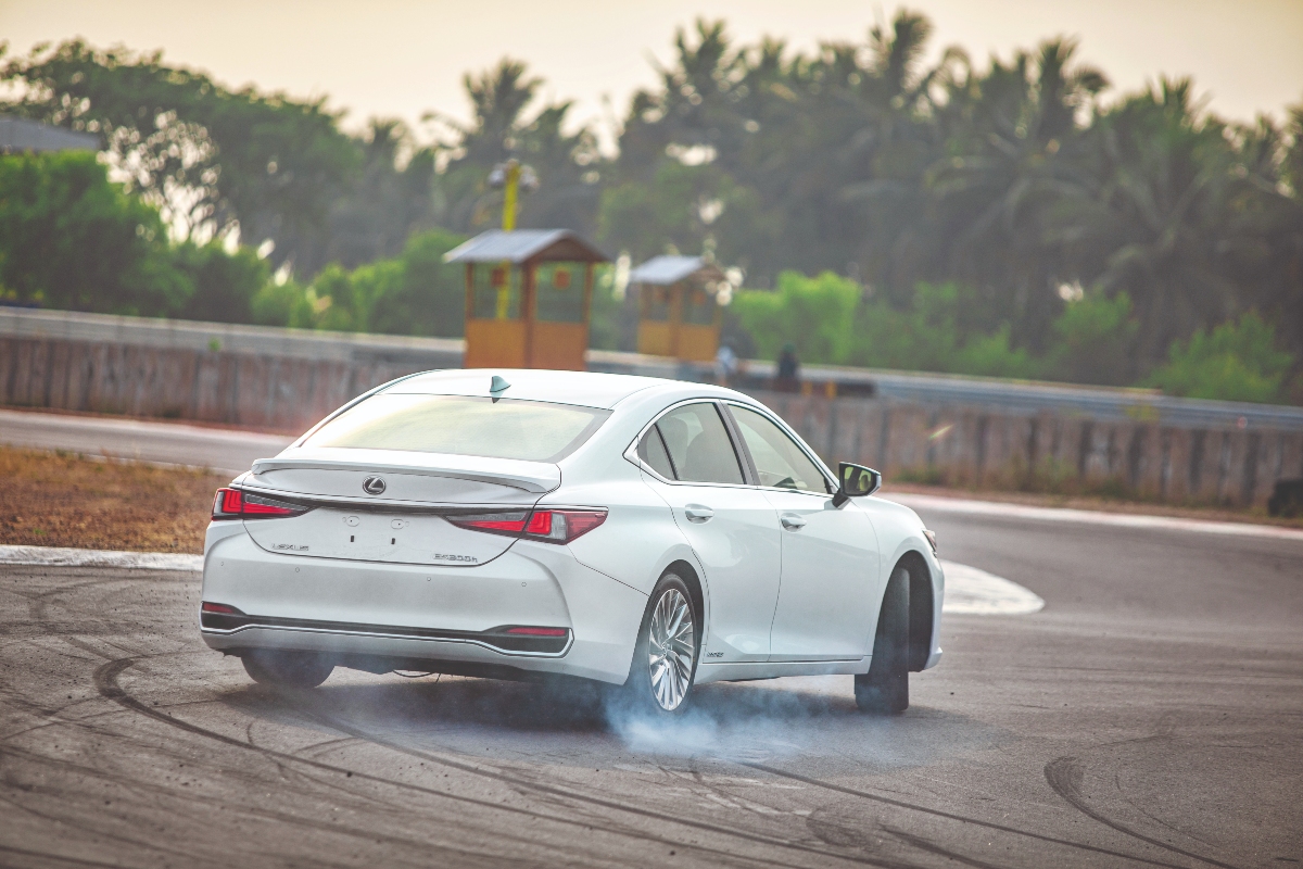 Much like the peacocks who don’t hear a thing as the Lexus ES 300h creeps down the straight. Pin drop silence. You could argue that this is a rather unlikely car to hit a race track with. This is — very evidently! — a big luxury car. The seat coolers are sending a nice chill up my backside. Cranking up the Mark Levison sound system on the way to the track gave us a stronger kick than caffeine. And the hybrid powertrain is genuinely good for the environment; on the city commute it will in fact run as a full EV for 60 per cent of the time, which means zero emissions for that period. This is the total antithesis of a track car. But we aren’t here to set a new lap record. We are only here to experience, first hand, the new track layout; find out if it is any better to drive, and do what we do best — chuck the Lexus sideways and be an absolute hooligan!
