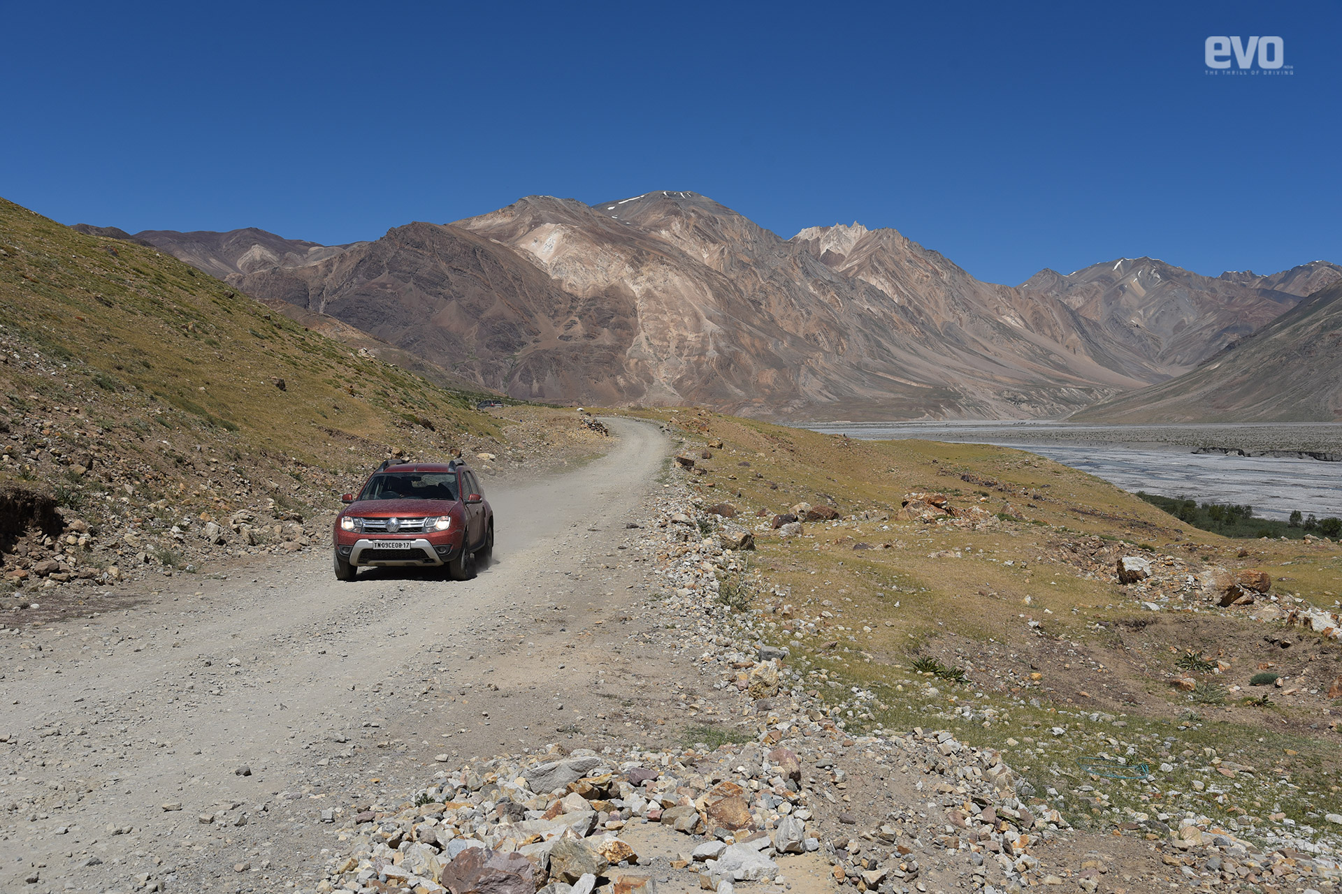 It is narrow but it is perfect. Like Angelina Jolie perfect. Like Ingrid Bergman perfect. Like Perfect. The Duster is at home here – I know it drives more like a car than an SUV – so I use its road manners to drive the daylights out of it. I drive it in the manual mode because that way I can smooth out the gearshifts, I can overtake at will and I prefer the greater control it gives me. Up here on the highest roads on earth, control is everything. We drive through sleepy villages and in no time, get to the village of Losar where a stream has pushed its way through the road. Now, when you are in a two-wheel drive vehicle, you need momentum and ground clearance. The latter the Duster has plenty of – 205mm to be exact. The momentum I provide. See, flooded places like this need the correct balance of speed and throttle control. Still in Manual mode, the Duster AMT lets me maintain just that. Not too slow to bog down, not too fast to sump the world’s most resilient rock and decapitate the car.