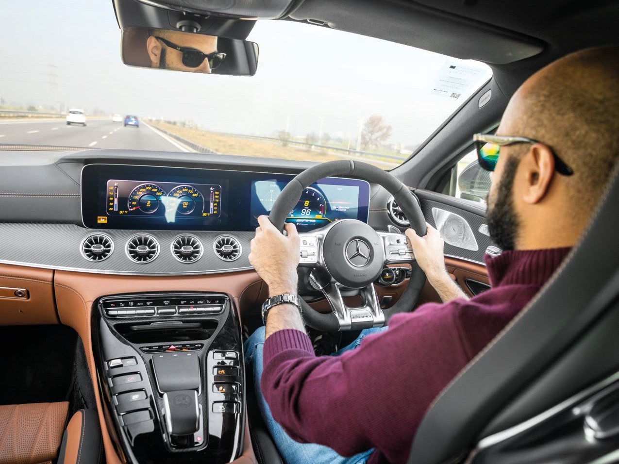 I’m nervous. Anyone with the keys to AMG’s most powerful production car would be. I touch the pulsating Start/Stop button on the dash and the V8 fires to life. I run myself through the numbers again. 3982cc. Two turbos. 630bhp. 900Nm. That’s more than the track-focussed AMG GT R! Gulp. It may have four doors and four seats, but it will still slingshot to 100kmph in 3.2 seconds thanks to all-wheel drive. Curling my fingers around the chunky Alcantara-wrapped steering wheel, I take stock of what lies ahead. Speed, in case that wasn’t obvious already. The steering wheel itself is a big, hefty piece of work. I turn it to manoeuvre the GT 63 out of the hotel parking lot, the slanted early morning light glinting off the machined metal spokes, as quad exhaust pipes burble away somewhere behind me.