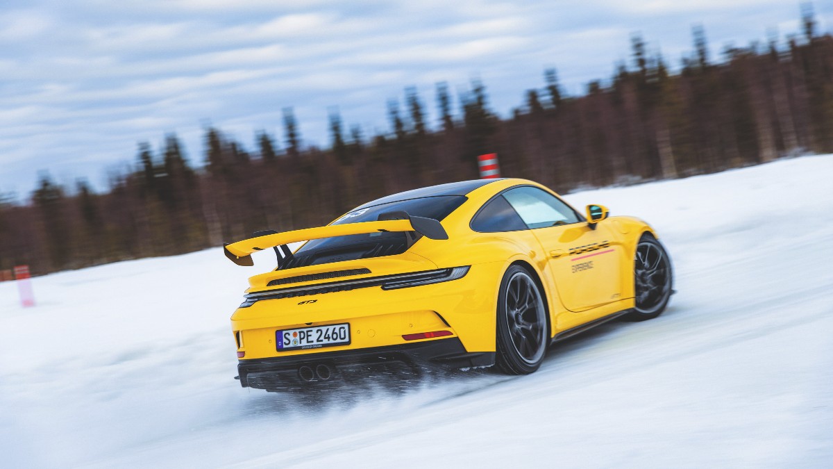 with a refresher of Ice Performance. It’s on an ice skid pad to get a feel of the throttle sensitivity, the uniquely 911 engine-behind the-rear-axle dynamics, the steering feel, and teach the ECU in your head how to keep it in a continuous drift through the circle. And one thing becomes immediately apparent. You must give it your all.