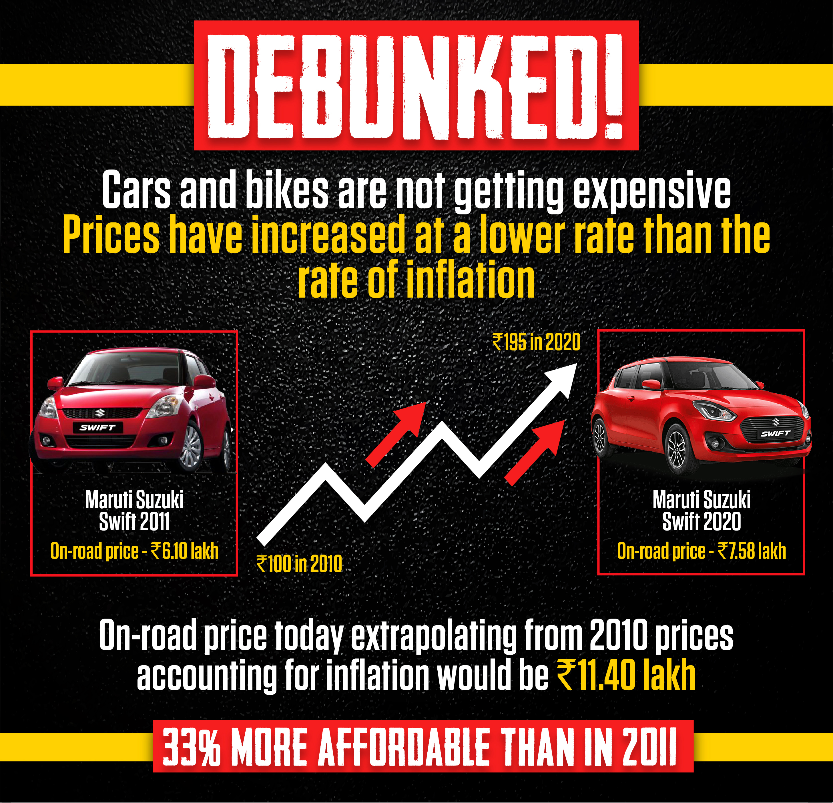 In light of that information, when you look at how prices have increased over the ten-year period, one thing becomes obvious. Cars and bikes have not become expensive. On the contrary, they have become cheaper - Rs. 6.1 lakh in 2011 (that's what a Maruti Suzuki Swift cost) is equivalent to Rs. 11.40 lakh in 2020, much lower than Rs. 7.58 lakh that it asks for today. Do the math and it turns out to be 33 per cent cheaper. 33 per cent! That's huge.