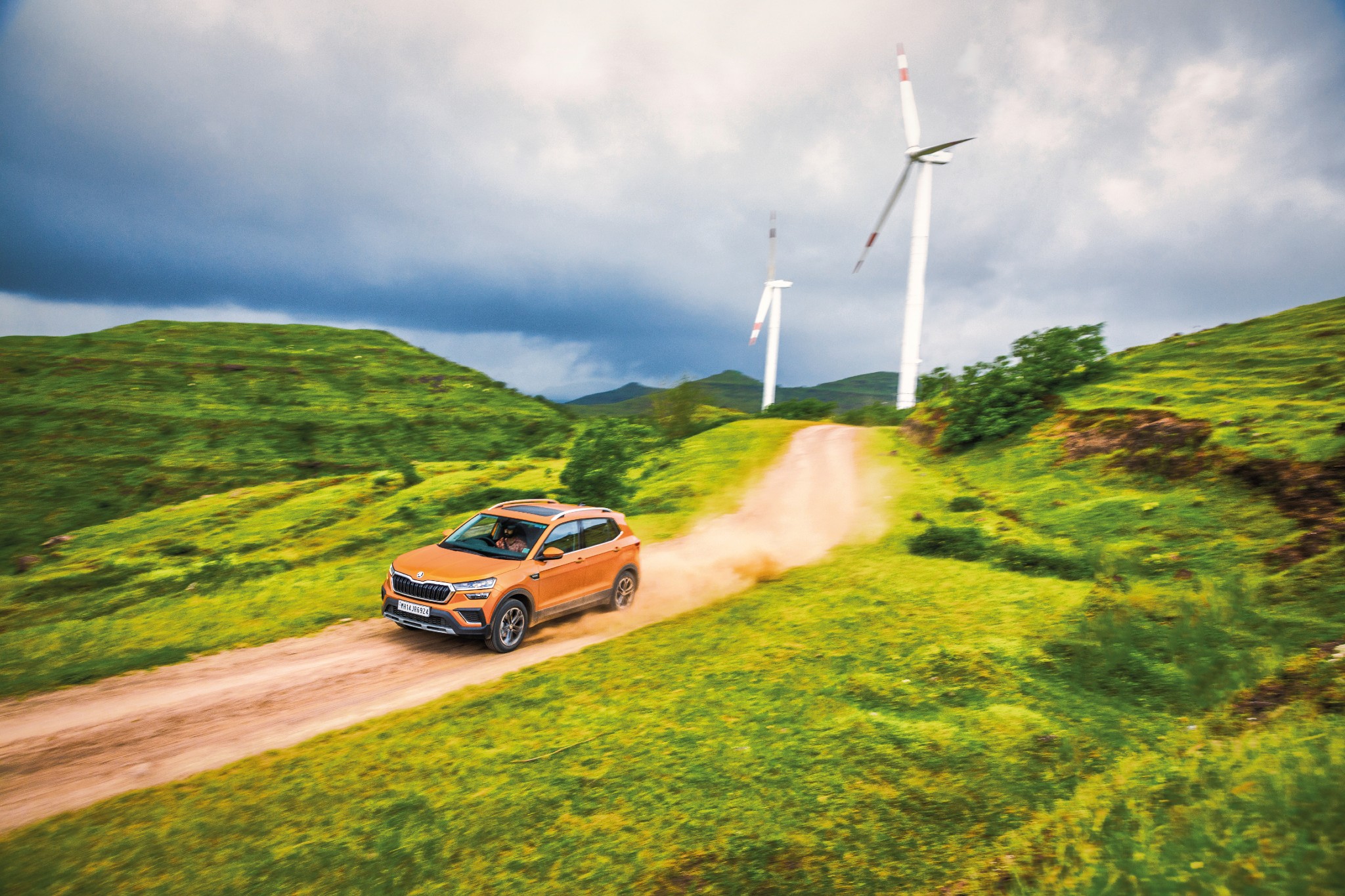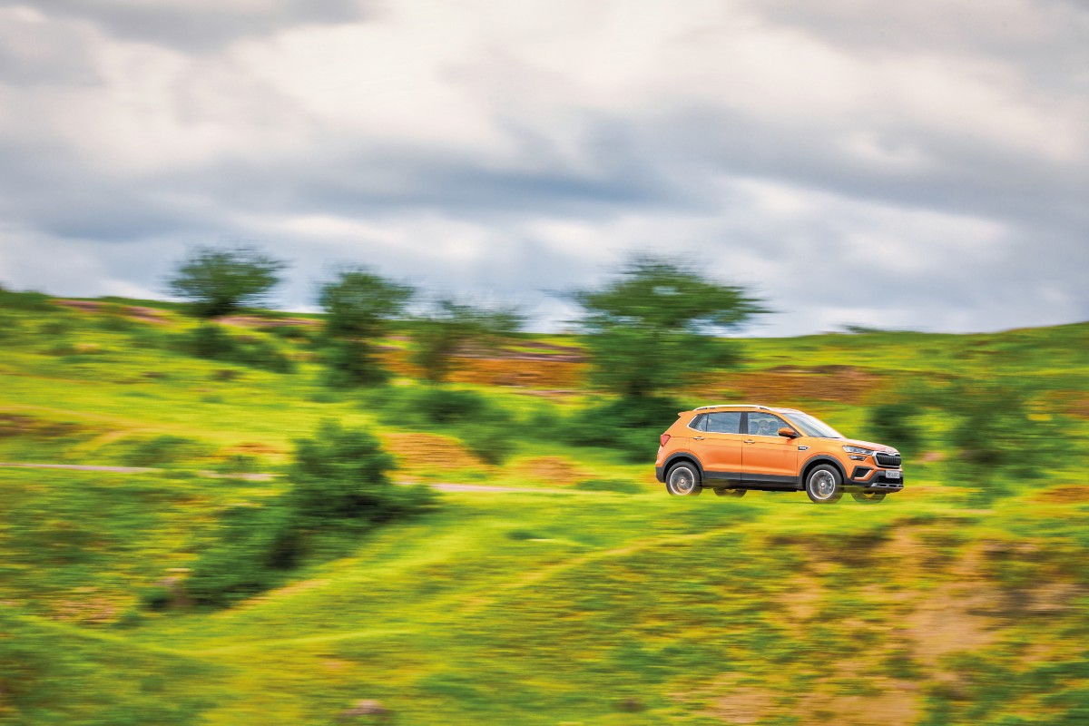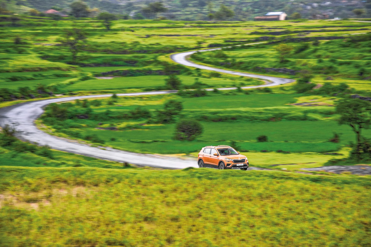 This is the ultimate shakedown for handling. It isn’t a road that you’d approach with abandon, but a rally stage — one of the many from the INRC’s Rally of Maharashtra. And while we aren’t rallying today, we are putting the Kushaq to its most demanding test yet. Dip the clutch in. Punch the starter button. The starter button isn’t on the dash but on the steering column exactly where you would have slotted in the key. I love that little flourish — a thoughtful touch reminding us of the analogue machines we used to drive. The 1.0-litre TSI engine is now thrumming enthusiastically, waiting for me to do something. I stab the throttle, and watch the revs rise and fall. The car is ready. I look up at the road ahead, with perfectly paved tarmac that ducks out of sight behind a hillock on the right and carries on, winding through the rolling countryside.
