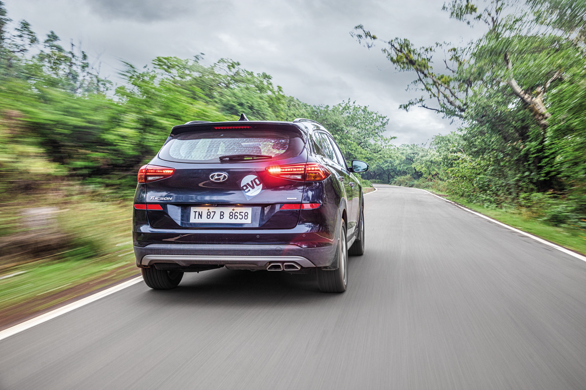 However, the climb demands the complete opposite from a car. Here dynamics, traction and composure matter. I might not be sending it, but I sure as hell am not crawling up either. And the Tucson holds its own. It allows me to commandeer it confidently up the narrow, winding road and despite its size and the fact that it sits tall on its suspension, it never feels unwieldy. One of the major changes to this facelifted Tucson was to the gearbox. Driving it back-to-back with the older car during our first drive review, I realised that the addition of two ratios allowed Hyundai to space the first couple of gears closer together and give it a taller final ratio. Not that you could tell when you just drove it in isolation. But climbing up the mountains the engine pulls its weight along confidently, while the snappy shifts from the transmission ensure a near uninterrupted delivery of torque. The all-wheel-drive system comes into play on these wet roads — a small graphic on the MID indicating when torque is sent to the rear. Useful. I do wish it had paddle shifters though.