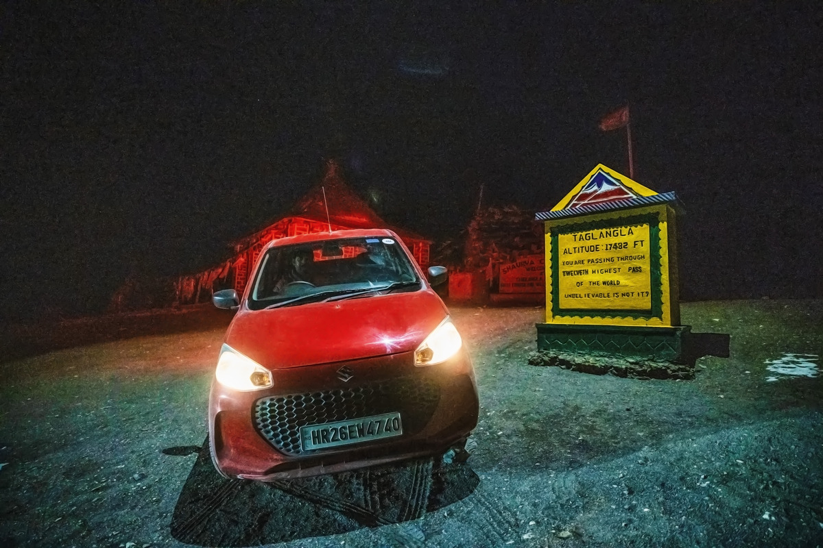 The sun had nearly set when we began our ascent, which meant we weren’t able to enjoy the stunning vistas Tanglang La is known for. Still, we had a record to set and were racing up the pass when, once again, we spotted snow in the distance. I wasn’t about to take any chances in the dark, so once again, our pace dropped significantly. Nearly ten hours into our journey, we had made it to the top of Tanglang La but we weren’t done yet. Our clock would pause only when we made it to our night halt at the small town of Karu. Thus began the scariest drive of my life – downhill, in the dark, in icy conditions, while nursing a renewed bout of altitude sickness. The Alto’s headlights led the way and I followed gingerly, being as smooth as possible with my inputs and relying on engine braking rather than the brakes. In case the car started to slide on ice, my best bet would be to aim for the side of the mountain and avoid the sheer drops on the other side. It never came to that – the mountain gods took mercy on us – and the snow dissipated halfway down. Eleven excruciatingly long hours after we set off from Umling La, we were finally at our night half of Karu. Time for some much-needed rest – big day tomorrow!