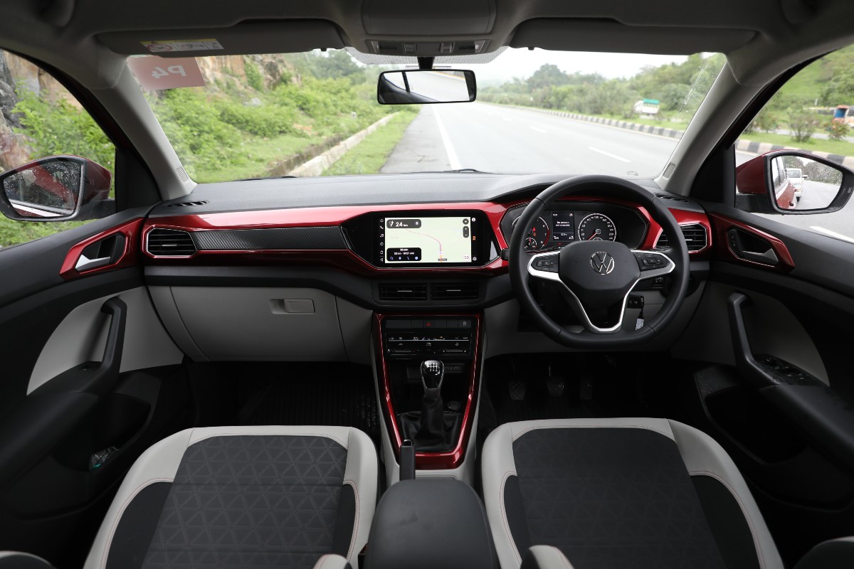 Cherry red accents liven up the cabin of the TaigunInside the VW Taigun