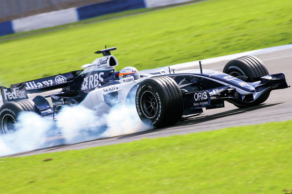 Narain locks a wheel during testing, 2006