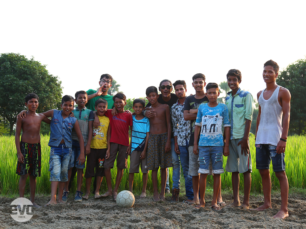 Team Evo with the local kidsThe kids however, continued merrily, perfecting their dribbles and shots, their eyes radiating something that we had seen not too long ago in the eyes of 60,000 people in Kolkata. Hope. Belief, even. Right after Team India equalised against Bangladesh, every touch, every pass was met with the belief that a winning move wasn’t too far away. Almost a thousand kilometres away, the kids in the paddy field with the ball at their feet, knew that a goal wasn’t too far away either. The stage was inconsequential. It didn’t matter.
