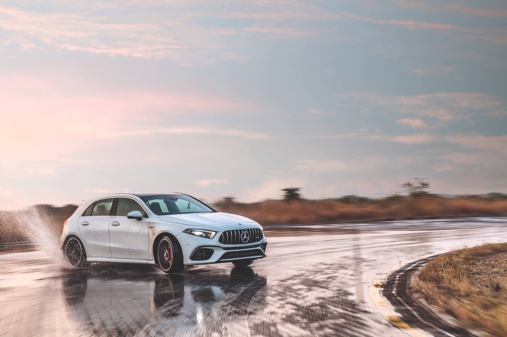 The wet track made for a fantastic settingAatish is right and Sirish responds by coming around a little slower, a little less dramatic, wheels now pointing straight and the A 45 S AMG settled in a neat four-wheel drift. Armfulls of opposite lock are admittedly more dramatic but this is automotive ballet. A dance on the edge of traction, with traction being the crucial word. While we want the car to be sliding we also want the tyres to grip, otherwise the car will just slide out of the skidpad. The tyres need to grip so that the power can be put down on the track to maintain the drift, and the tyres also have to deliver feedback so that Sirish knows what’s going on underneath him.