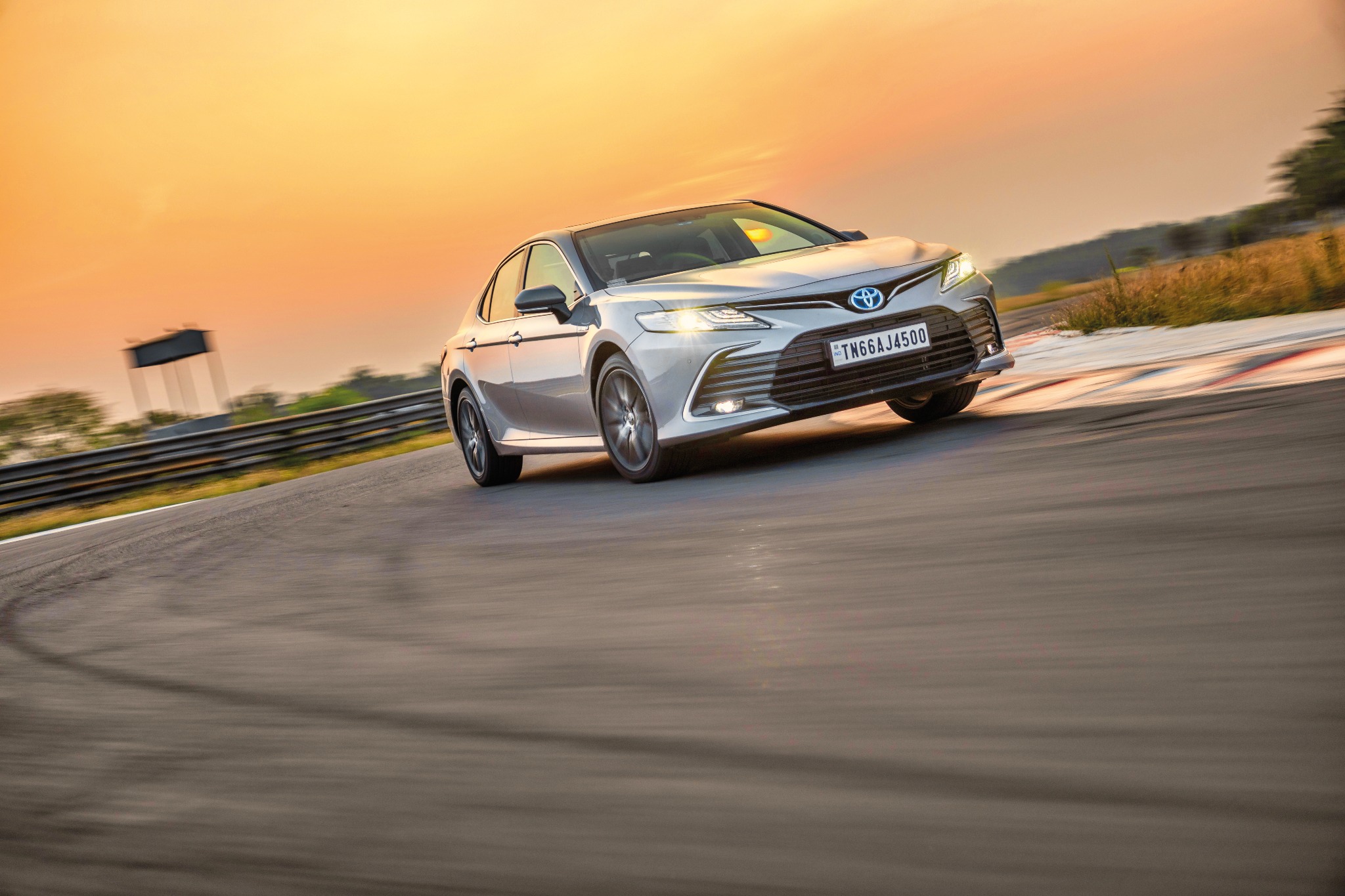 We roll into the pits. The Camry may be a luxury sedan but it looks at home here. It’s low slung and purposeful. Proportions don’t get more stunning than its cab-back design with a long bonnet and stubby boot. Large 18-inch wheels add to the bling while the face is all sharp cuts and creases. Properly aggressive looking, this. The blue tint surrounding the Toyota logo — indicating this is a strong hybrid — was standing out in the soft morning light. And while we could gawk for longer, the call of an empty racetrack is far more seductive. I take it easy on the out lap. I’ve been to Kari’s new layout before but it’s always good to spend some time refamiliarising yourself with the place. I pick out braking markers, apexes and revise the lines in my head all the way through until I come around the last corner. Punch the driving mode button and put it into Sport mode. Long press the ESP button to turn it off. And I give it everything. Smash the throttle to the floor and the Camry calls on the ICE and the electric motor to deliver every ounce of power they can. This is an incredibly complex system but it works seamlessly — the electric motor supplementing the engine and filling in the gaps in the torque curve to deliver a constant, seamless shove. The 2.5-litre nat-asp engine makes 175.5bhp and 221Nm, while the motor generates 118bhp and the total system output is an impressive 215bhp. 0-100kmph comes up in 7.8 seconds. And it feels fast. Coming out of the last corner, you can feel the drive it has down the main straight, leading to C1. The Camry has a CVT so you aren’t really banging through the gears as you pick up speed but you can access predetermined ratios using the paddles. There’s no tacho either but the dial showing what’s going on with the energy system is pinned to the power end of the dial, while the speedo climbs past 130... 140… 150kmph. Toyota knows its way around hybrids that focus on performance. Using hybrid power the Toyota Gazoo Racing Team has won the 24 Hours of Le Mans for four straight years. And in the WRC the recently unveiled hybrid Rally1 Yaris performed incredibly well, placing second overall and ensuring that the team is the front runner for the championship this year. Smash the brakes for C1 and the car shaves off speed confidently. The car may be harvesting energy from braking but the feel at the pedal and the stopping power isn’t compromised. In fact, the brakes give you plenty of confidence to push lap after lap, resisting fade and remaining consistently strong with their bite. Turn in for C1 and the Camry reacts deftly. You need to remember — this is a luxury car. It comes packing all sorts of excesses to keep its occupants pampered. It is heavy. But at the same time, it handles well. Being a sedan, the centre of gravity is closer to the ground and that means there’s less roll. The suspension has been set up for comfort so when you do push the limits of the car, you will find it leaning over to one side. But it settles there quickly and loads up the outside to give you a good amount of grip. The tyres squeal, and the trick is to keep it at the limit of adhesion. Too much speed, and you’ll scrub the fronts as you understeer — killing the tyres and your lap times. The chassis communicates what’s happening at the front very well. You can feel the steering load up in the corners, there’s plenty to be felt through the seat of your pants and it allows you to understand and get to grips with the Camry very quickly. I feel at home within three laps. And I am flagged in on my fourth. Arjun Balu is here.