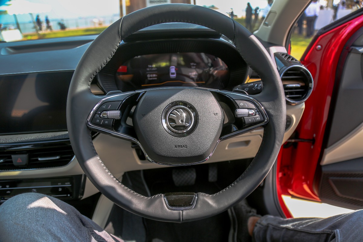 The two-spoke leather wrapped steering wheel is the same as offered on most Skoda models