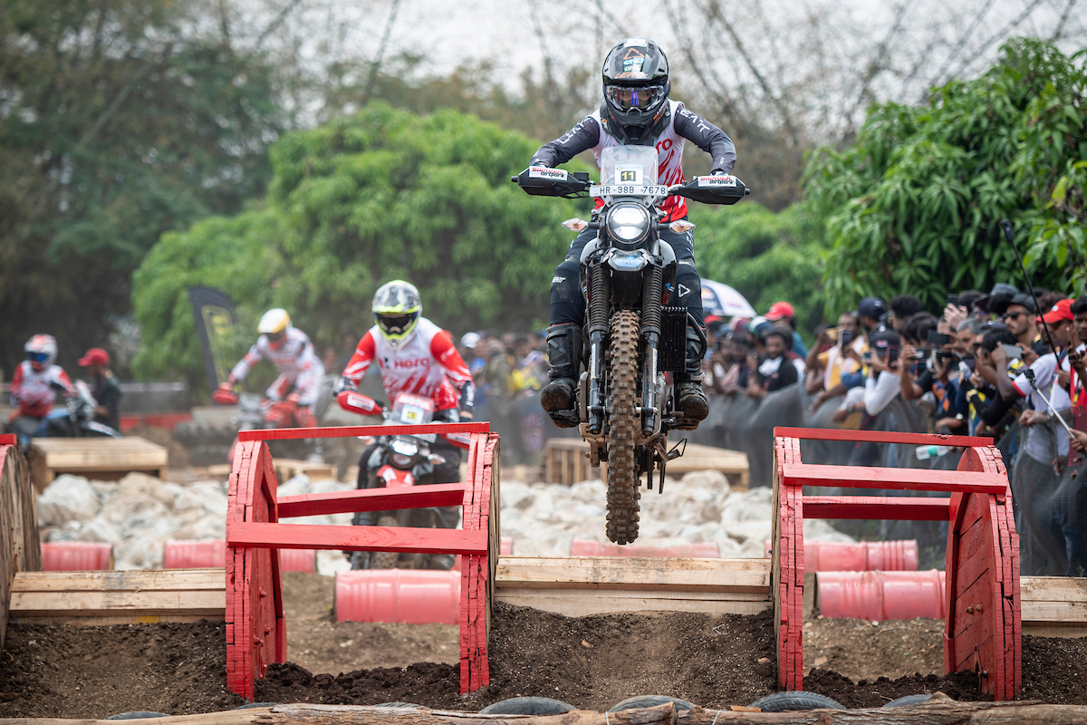 The Masterpiece at the Red Bull Ace of DirtThe Red Bull Ace of Dirt was hardly an easy affair for even experienced riders and this time around the track has become more demanding and complex with the addition of quite a few obstacles. The track is approximately 1.2km long designed by C S Santosh and his team with the goal to make it as challenging as possible for the competitors. some of the noteworthy obstacles include the Mudpie — a steep downhill slope with a puddle of slush at the bottom followed by a steep uphill climb, the Splatter — a near-vertical climb followed by tractor tyres set in staggering sizes and the newly added Wall Ride which is basically a wall placed at a 45-degree angle right next to a bed of rocks, so the rider has to either choose the wall or the rocks. Most of the riders were riding Hero Xpulse 200s or Hero Impulses.