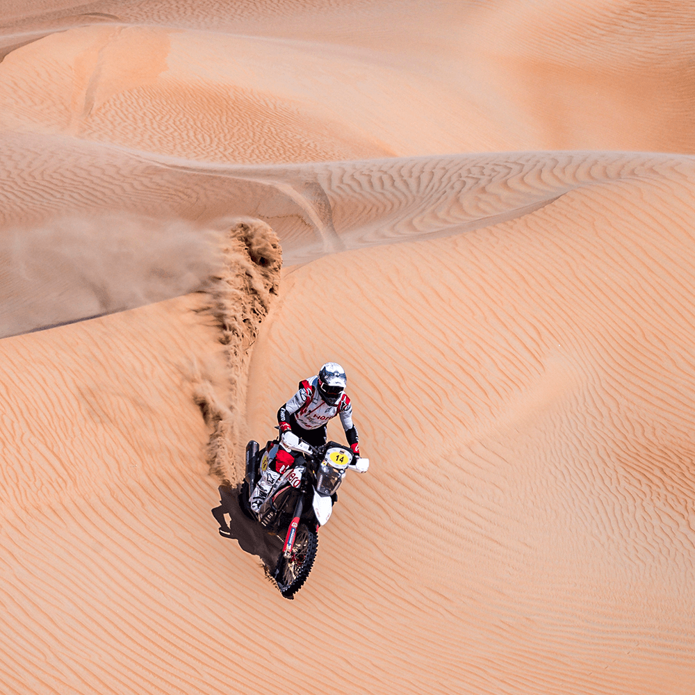 Sebastian Buhler got a good taste of the coming stages in his run on the first stage. He was one of the early starters, but quickly managed to overtake the ones ahead. From then he was the lead bike which meant that he did not have a guide for navigation and had to find his way through the dunes of the Abu Dhabi desert. This cost him time but managed to complete the section without putting a foot wrong and finished in P8.