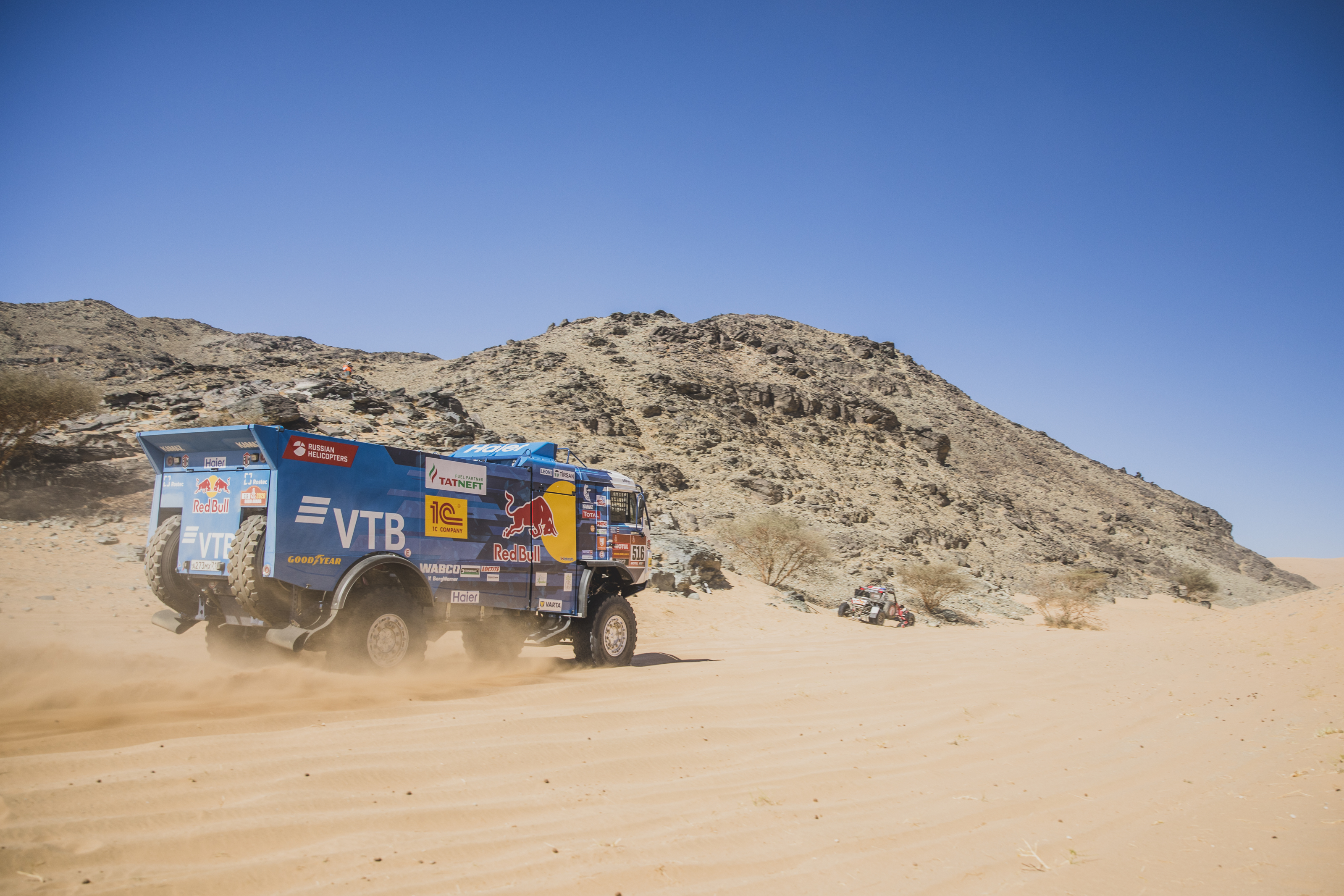 Anton Shubalov and his crew led after the first stage in the Kamaz-Master truck, closely followed by the Belarusian crew in the Maz-Sportauto piloted by Siarhei Viazovich finishing just over one and a half minutes behind. Petronas Team De Rooy Iveco came in third place with Janus Van Kasteren at the helm, 3 minutes behind the leader. Three time winner Eduard Nikolaev came in 10’th place, 11 minutes 24 seconds behind the leader.