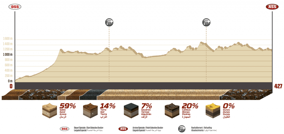 The 427km loop in Neom posed a huge challenge as the terrain again included rocky sections with the added challenge of dust.