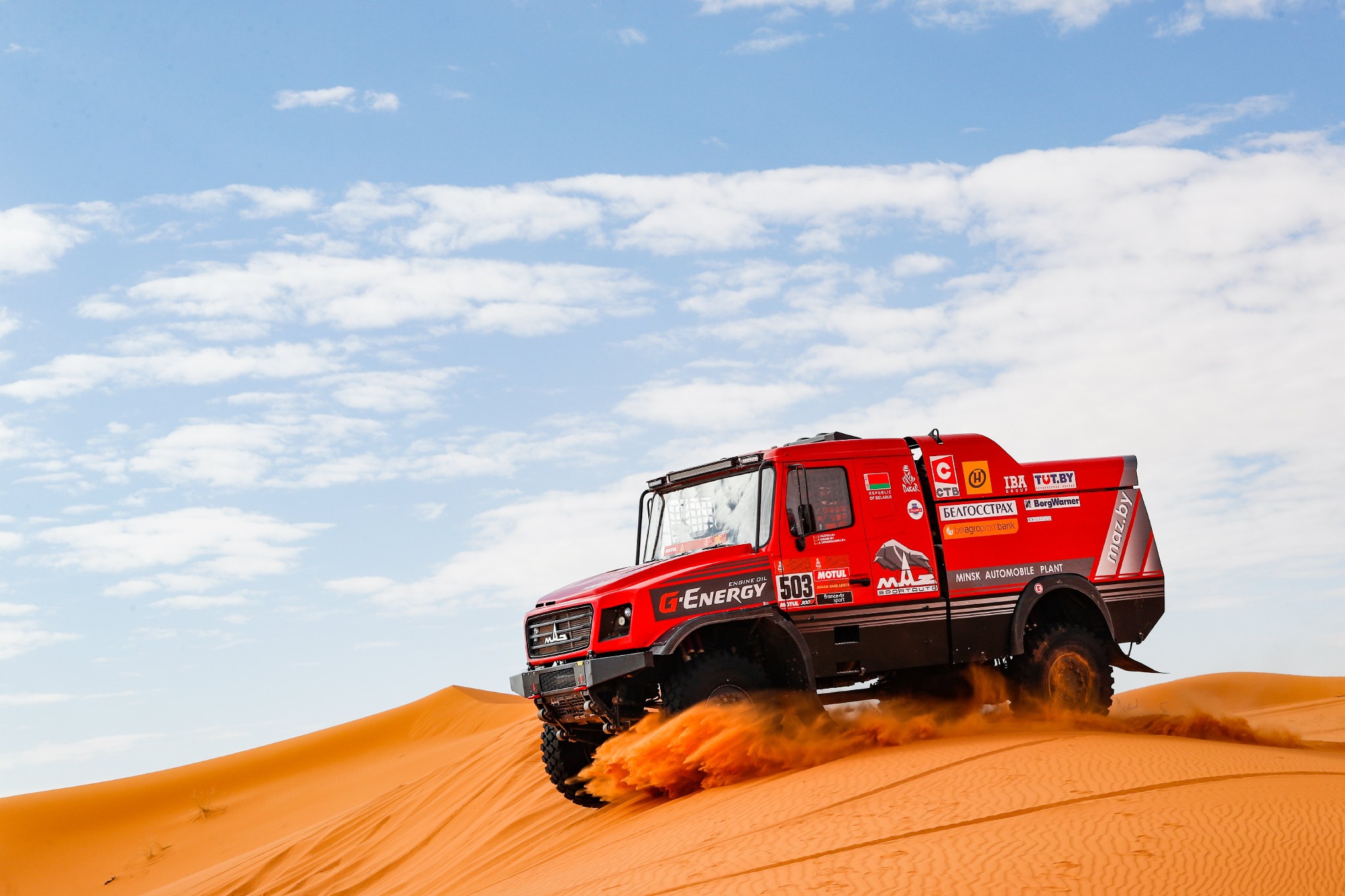 Stage three around Wadi Al-Dawasir began with the Kamaz 43509 truck driver Dmitri Sotnikov, thus far the leader, in the first place. Following him was Aliaksei Vishneuski and Siarhei Viazovich of team Maz-Sportauto in their Maz 6440RR truck.