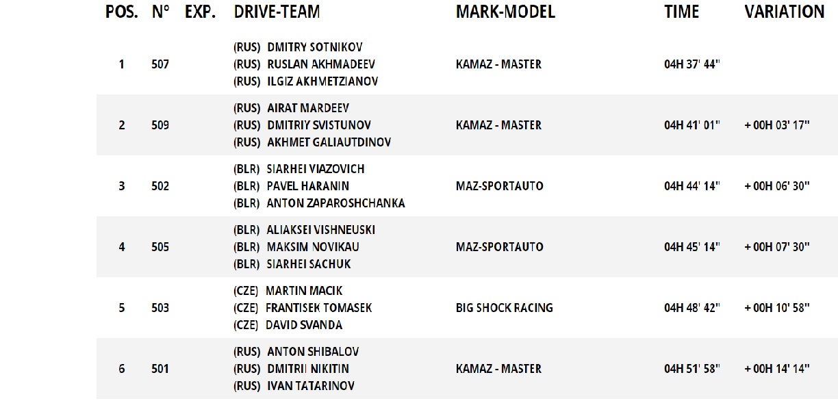 After the prologue and stage 1, the final standings in the truck category were Sotnikov leading the category followed by Loprais and Shibanov in the third position. The Kamaz Master team has been dominating in the truck category from the 1990s and has won a record number of 17 wins so far.