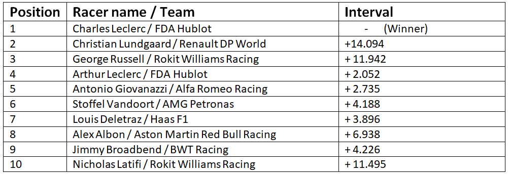 In the penultimate lap of the race, George Russell was still keeping Arthur Leclerc at bay, despite the fact that Russell was on medium-compound tyres while Leclerc was on hard-compound tyres. The last lap saw two-time F1 winner take the win with a commanding, 14-second lead over Christian Lundgaard, who himself was a yawning 11.9 seconds ahead of George Russell. Despite his strong performance, Arthur Leclerc finished the race in the fourth place, a scant (by this virtual race’s standard) two seconds behind Russell.